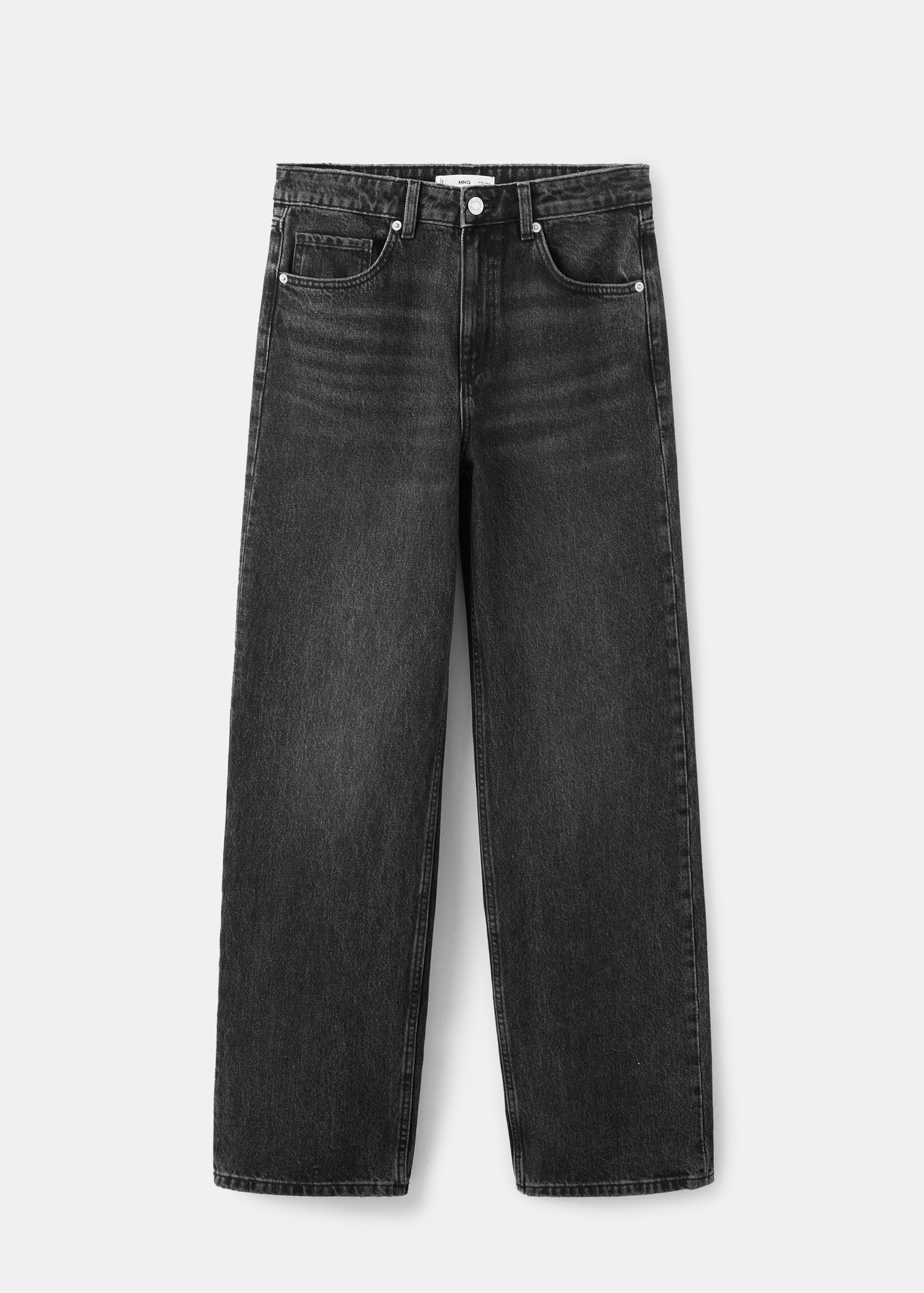 Памучна материя в каубойски стил деним. Дълъг дизайн. Прав силует. Ниска талия. Халки за колан. Пет джоба. Предно закопчаване с цип и копче.
