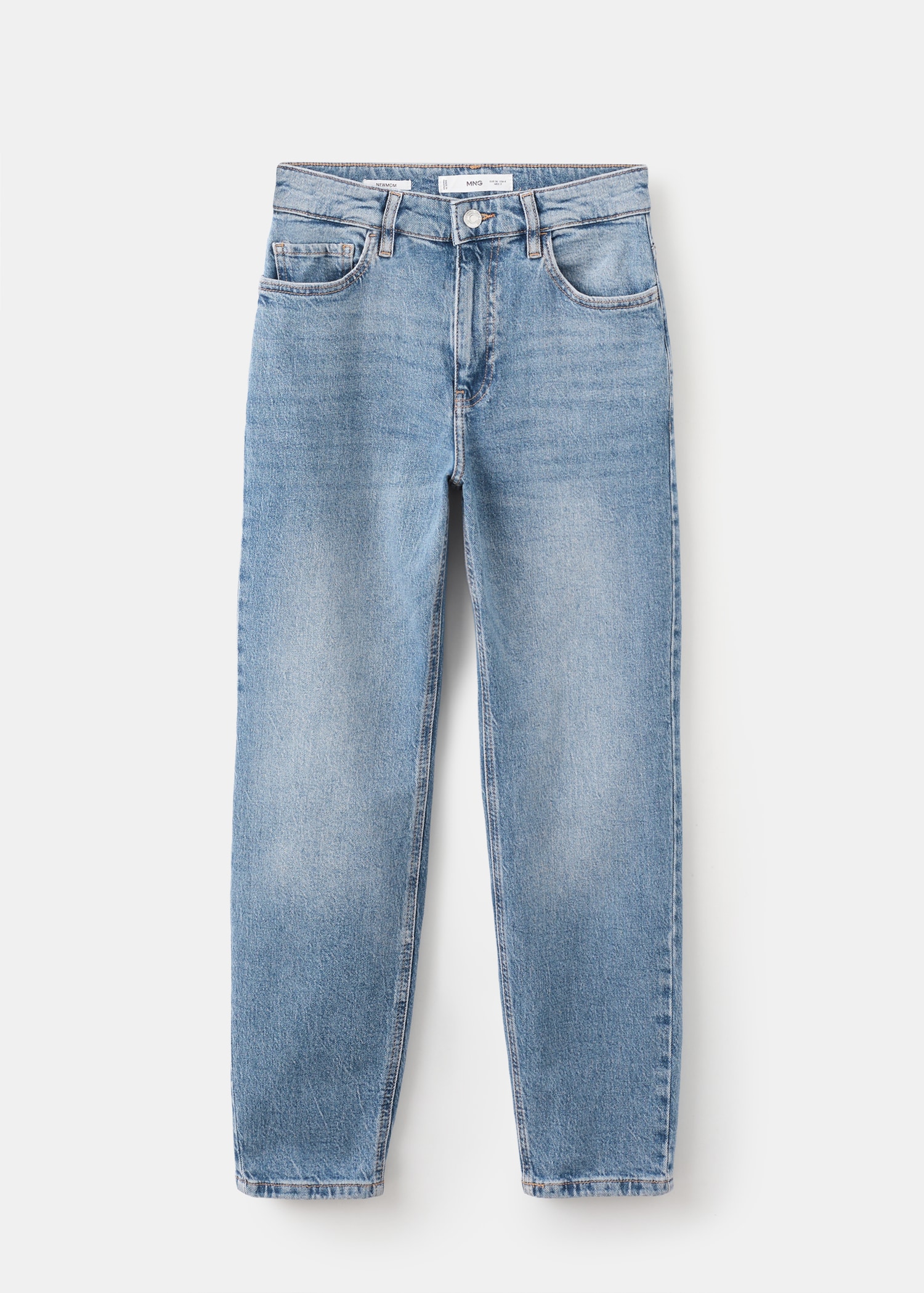 Памучна материя в стил деним. Удобна еластична материя. Кроп дизайн. Mom-fit. Висока талия. Халки за колан. Пет джоба. Предно закопчаване с цип и копче.