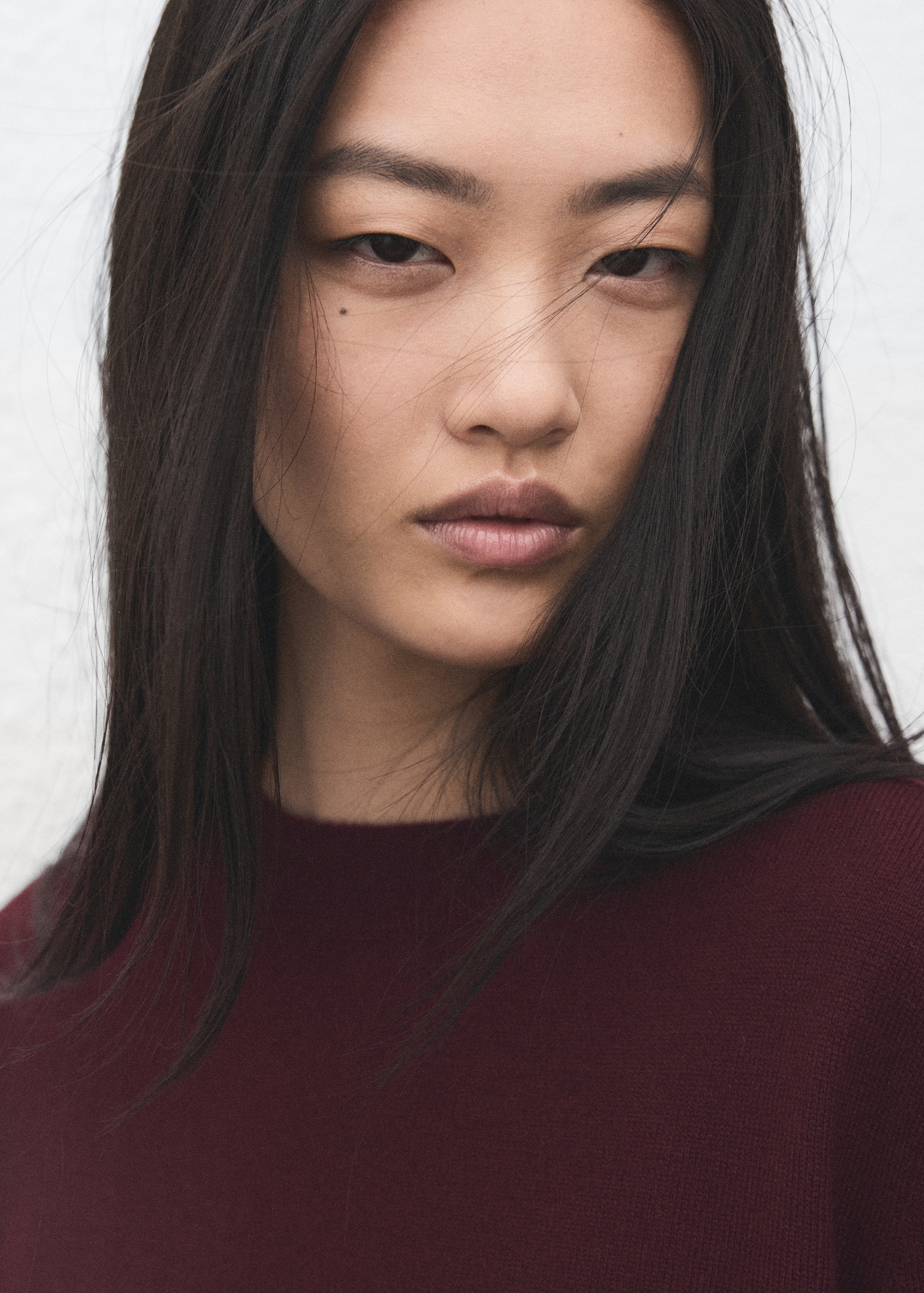 Смесена вълнена материя. Фина плетена материя. Прав дизайн. Кръгло деколте. Дълъг ръкав. Завършвания с рипс. Без закопчаване.