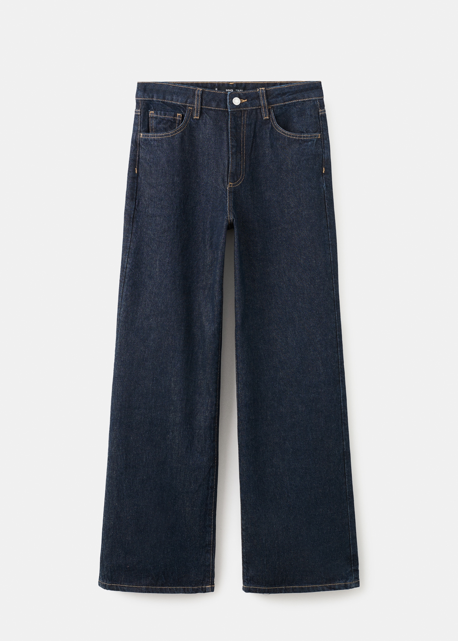 Памучна материя в каубойски стил деним. Дълъг дизайн. Дизайн с широки крачоли. Висока талия. Халки за колан. Пет джоба. Предно закопчаване с цип и копче. Вътрешна дължина 84,5 см.