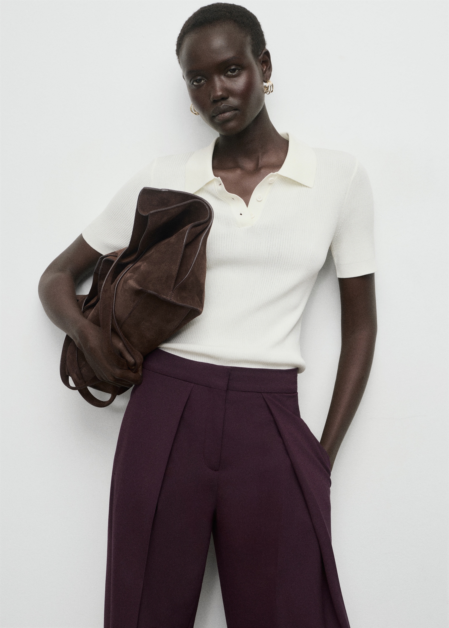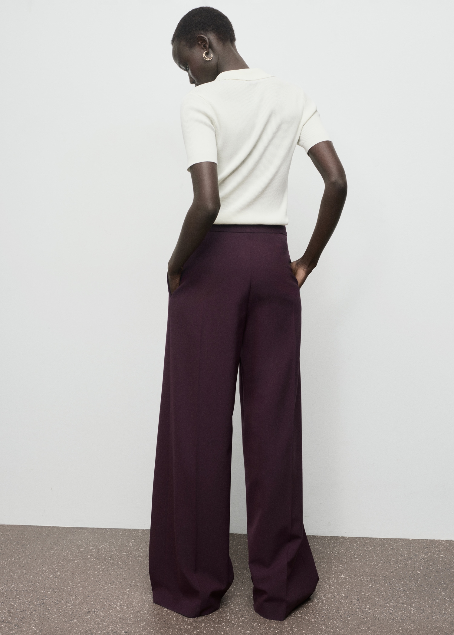 Дълъг дизайн. Дизайн с широки крачоли. Средна височина. Детайли с предни плисета. Два странични джоба. Скрито закопчаване с копче, кука и цип. Вътрешна подплата.