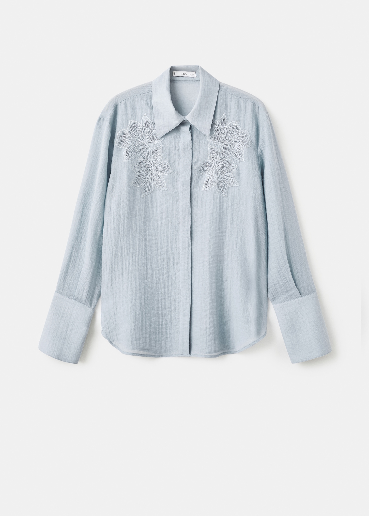 Изработена от смесена материя с лиосел и бродирани флорални детайли, тази дреха има прав дизайн с яка тип риза и дълги ръкави с маншети с копчета. Има предно закопчаване със скрити копчета