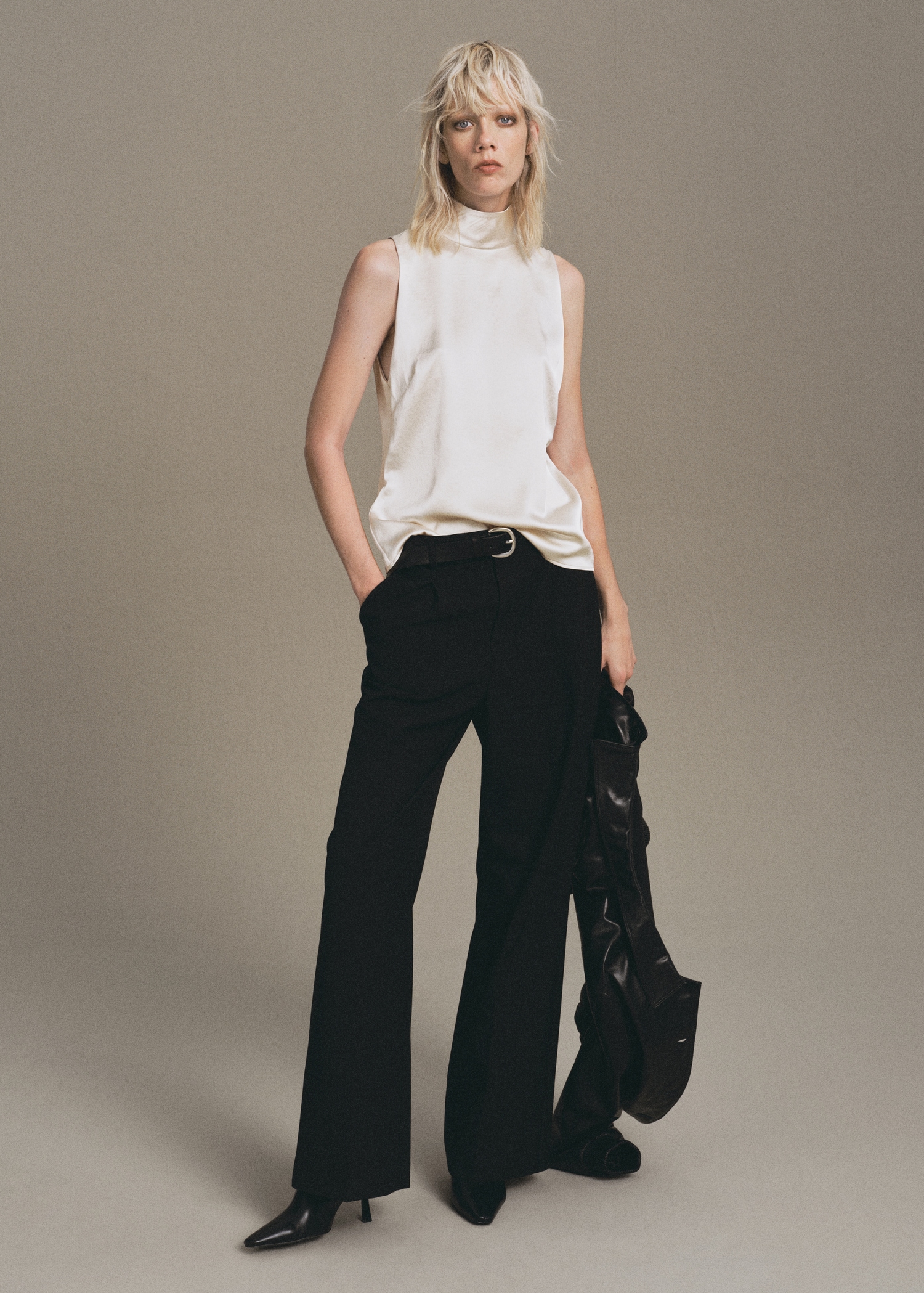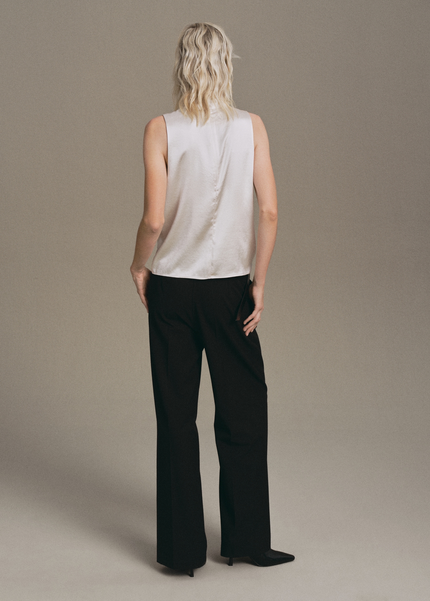 Изработена от сатенена материя, тази дреха има прав дизайн с висока яка и без ръкави. Задният цип улеснява носенето.