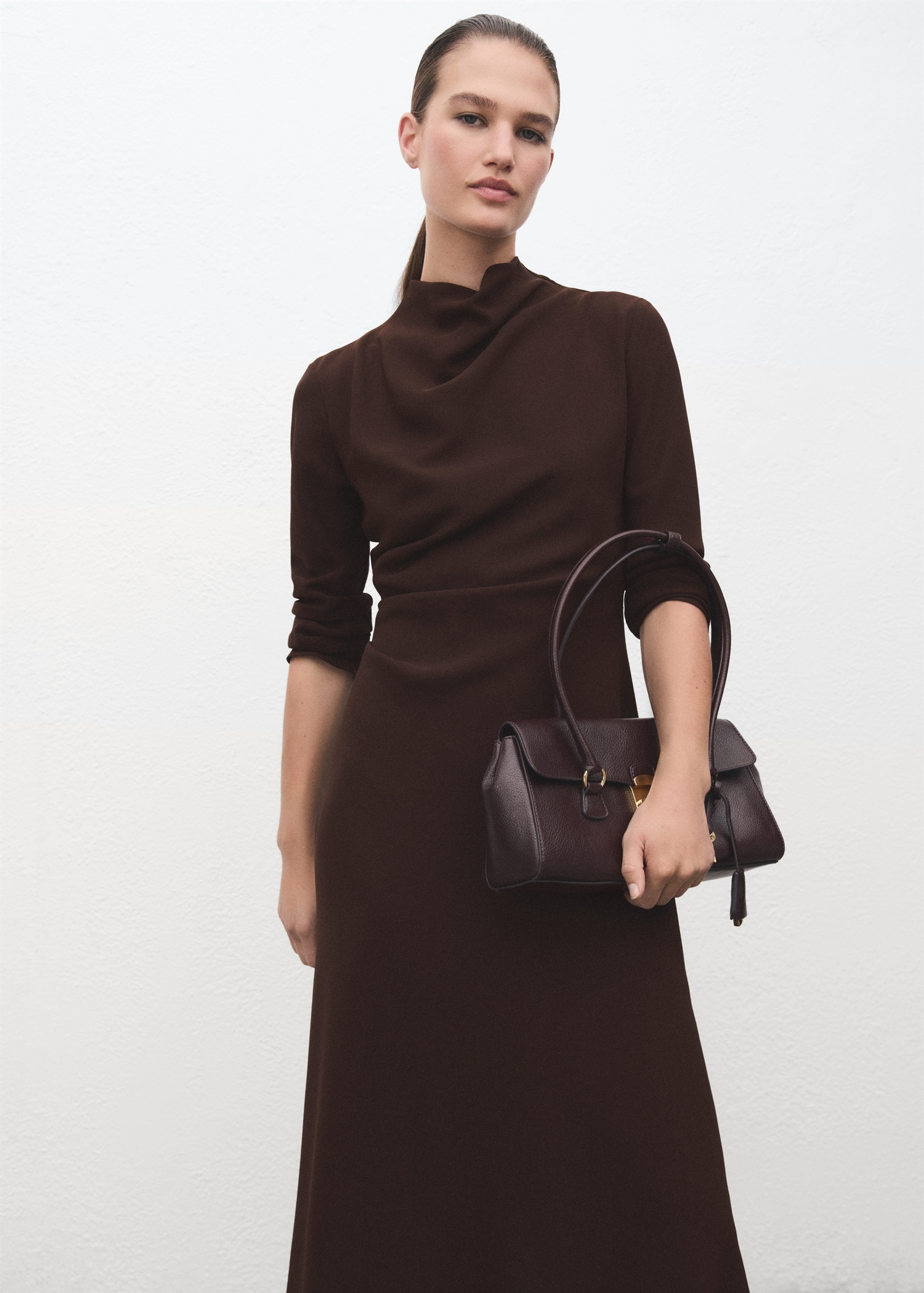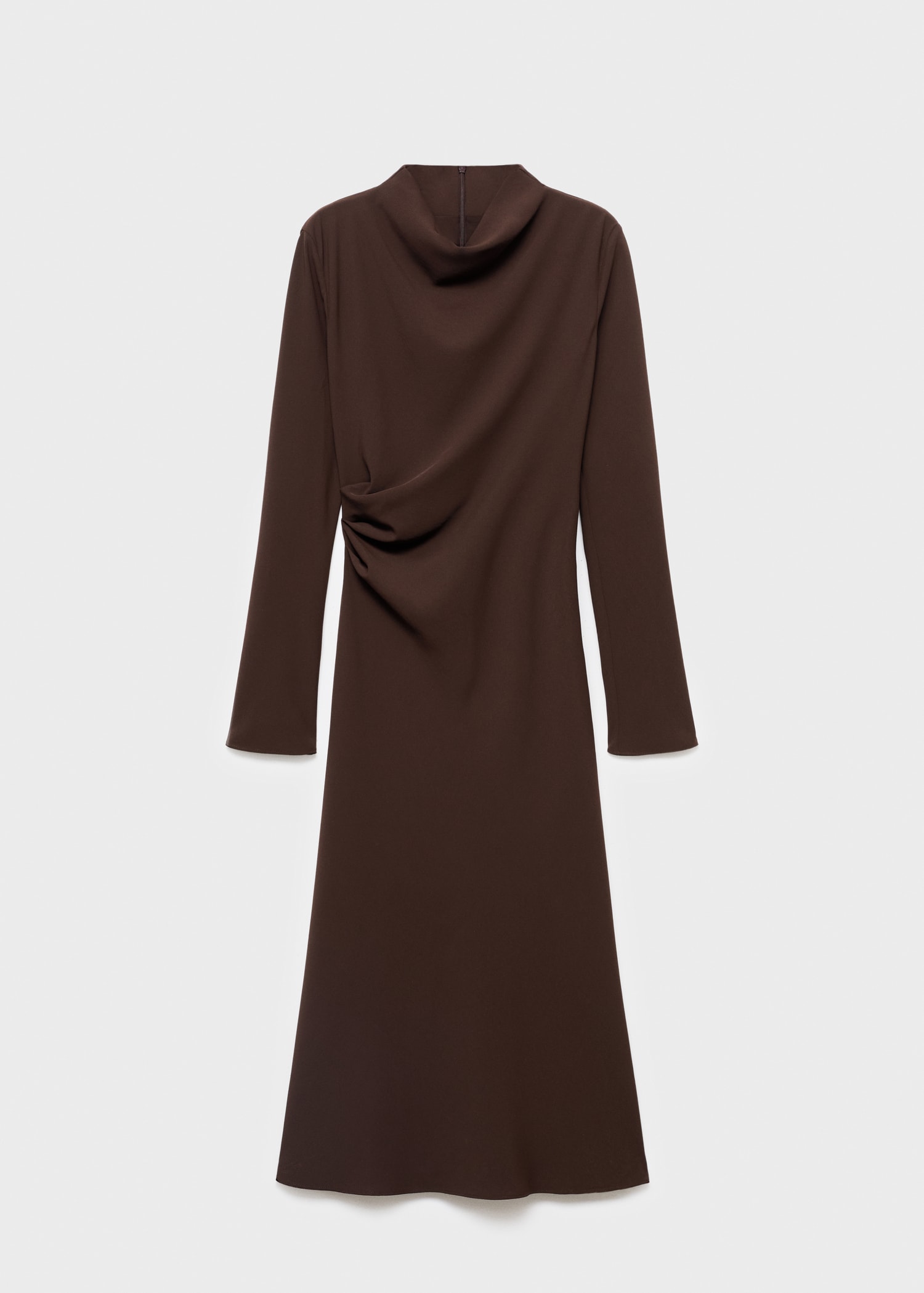 Миди дизайн. Дизайн тип трапец. Драпирана яка. Дълъг ръкав. Волани отстрани. Цип на гърба. Вътрешна подплата.