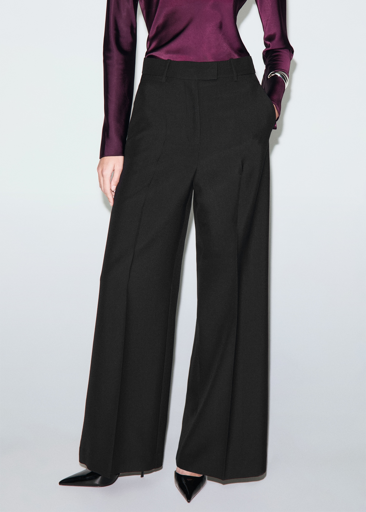 Стил костюм. Смесена вълнена материя. Дълъг дизайн. Дизайн с широки крачоли. Средна височина. Халки за колан. Два странични джоба. Предно закопчаване с копче, кука и скрит цип с капак. Вътрешна подплата.