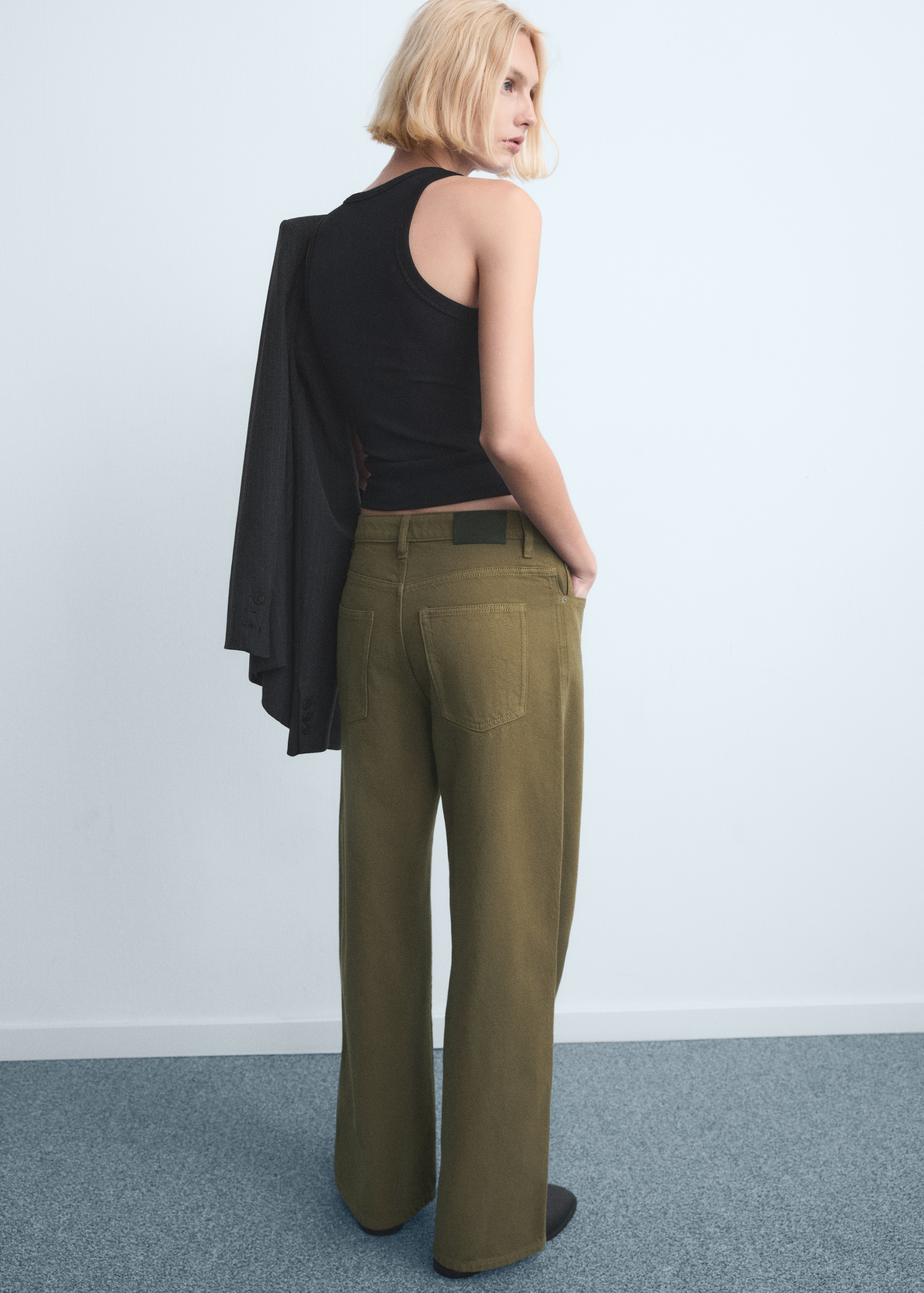 Памучна материя в стил деним. Дълъг дизайн. Балон дизайн. Кройка Barrel. Ниска талия. Халки за колан. Пет джоба. Предно закопчаване с цип и копче.