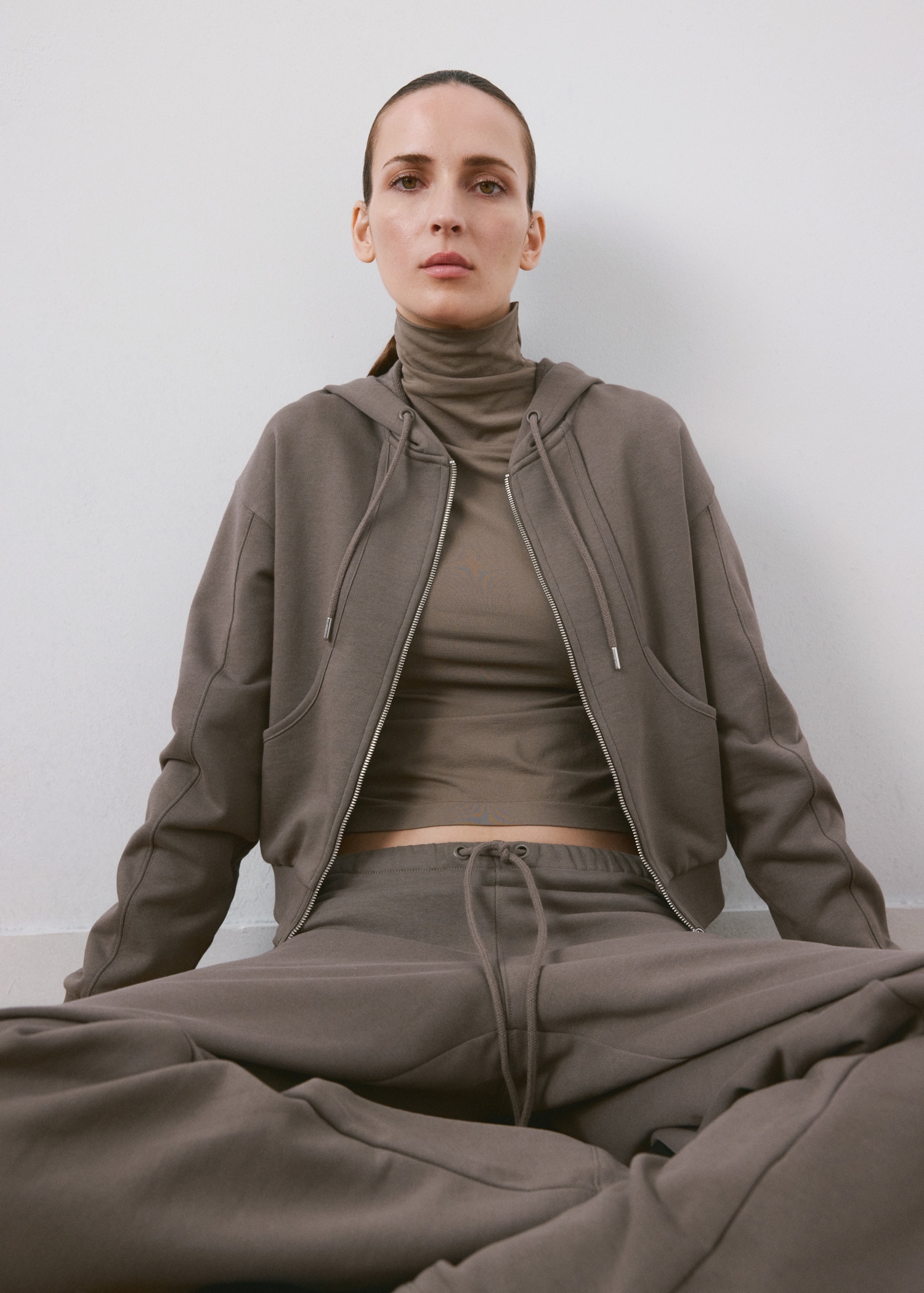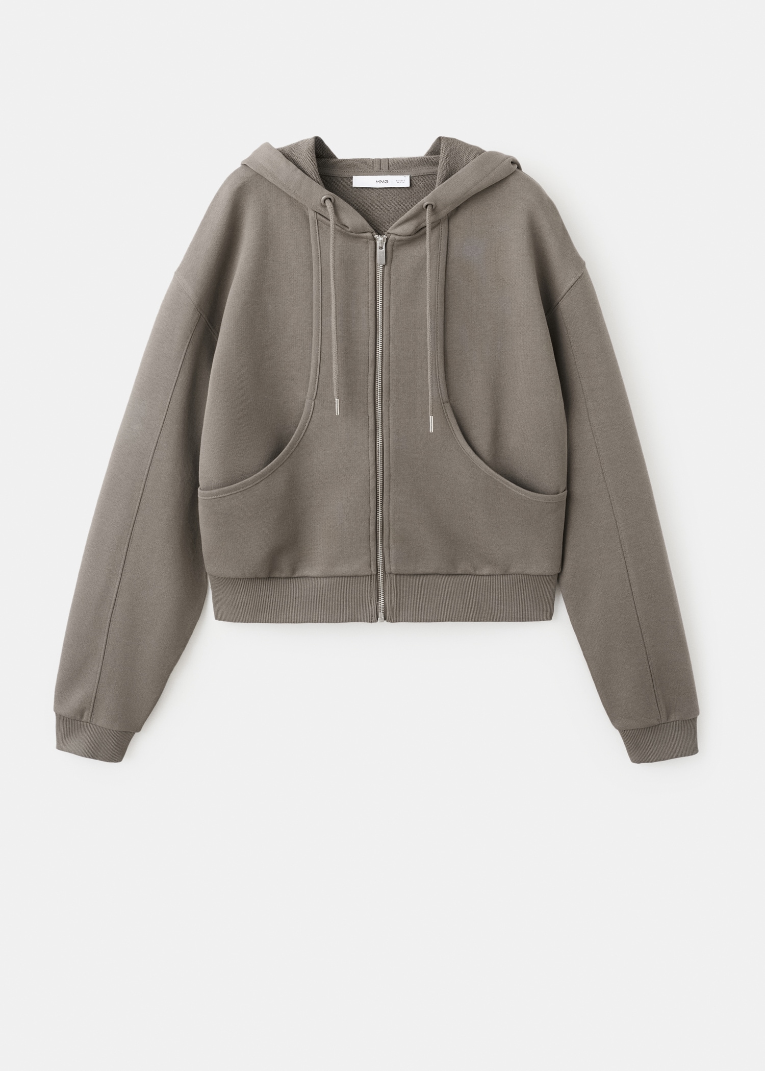 Прав силует. Яка с ревери Качулка. Контрастни шевове. Дълги ръкави. Два странични джоба. Закопчаване с цип отпред.