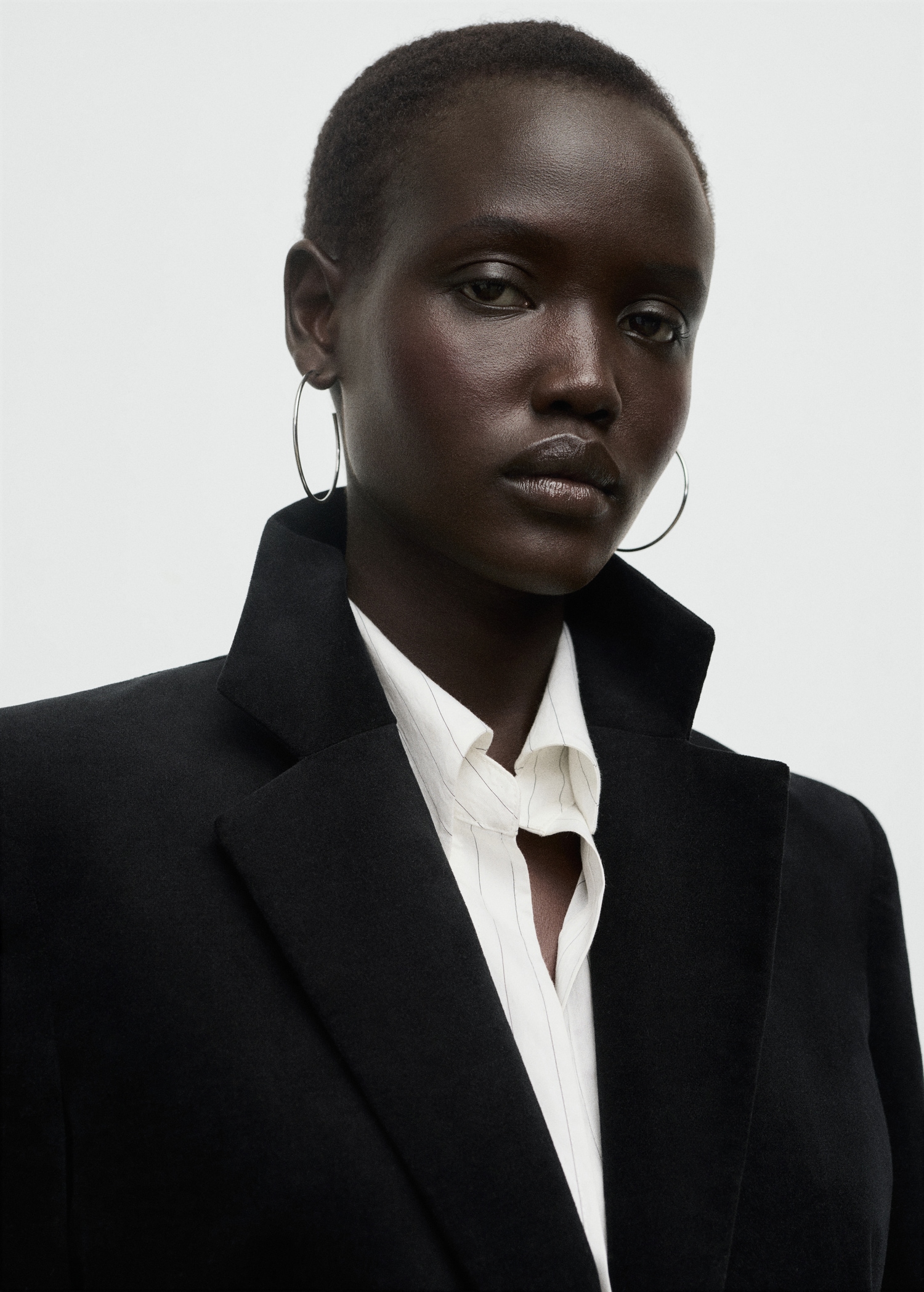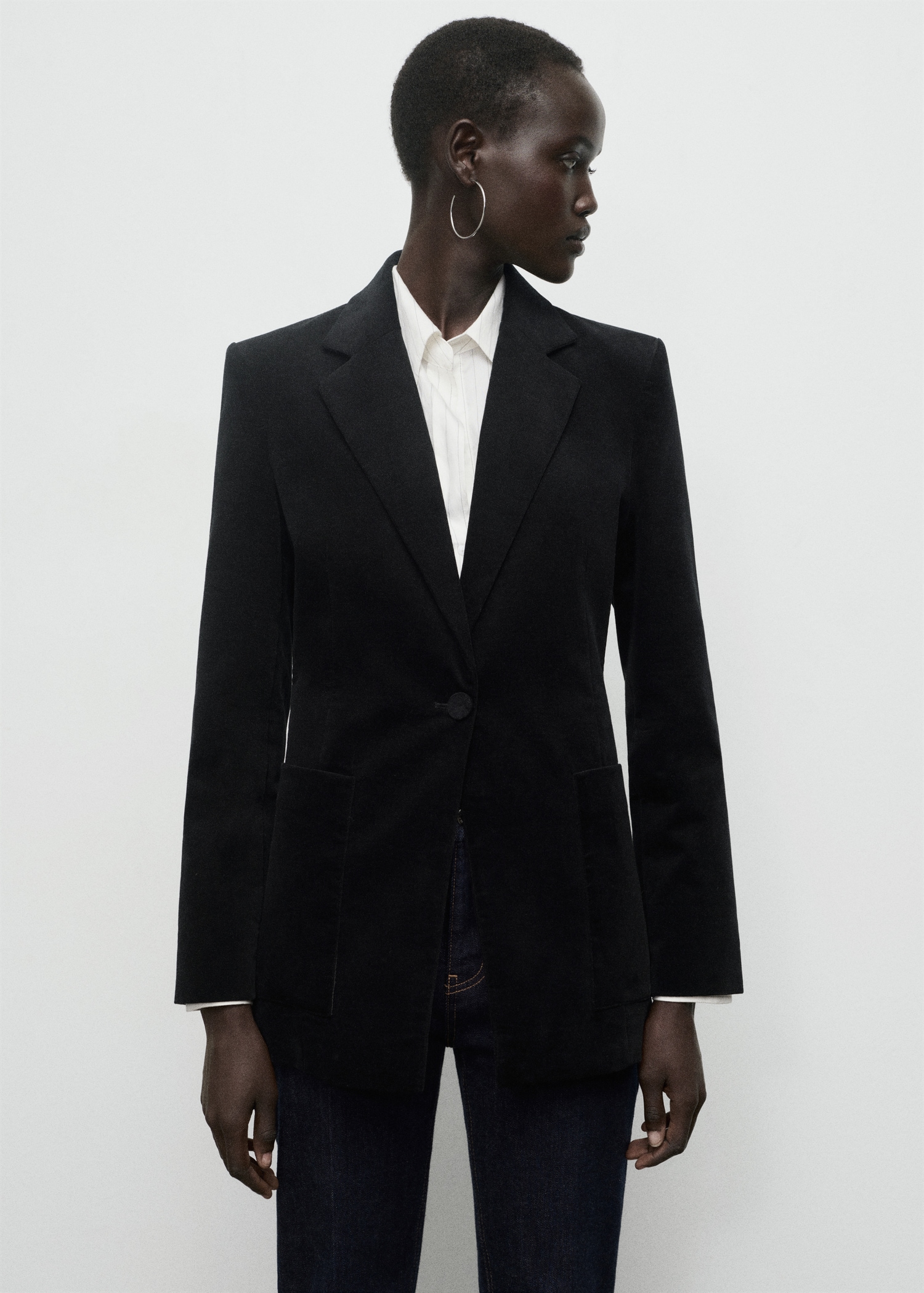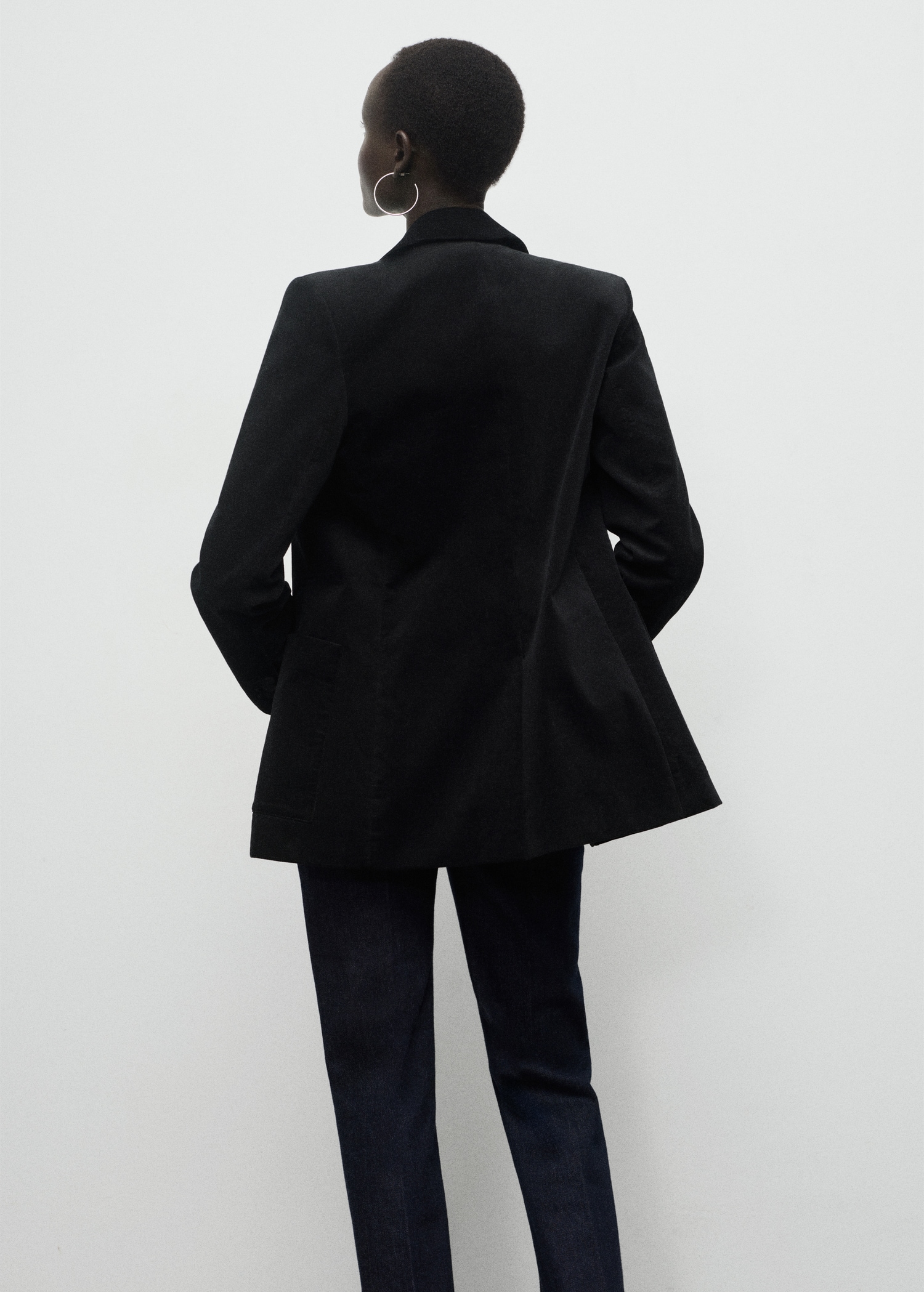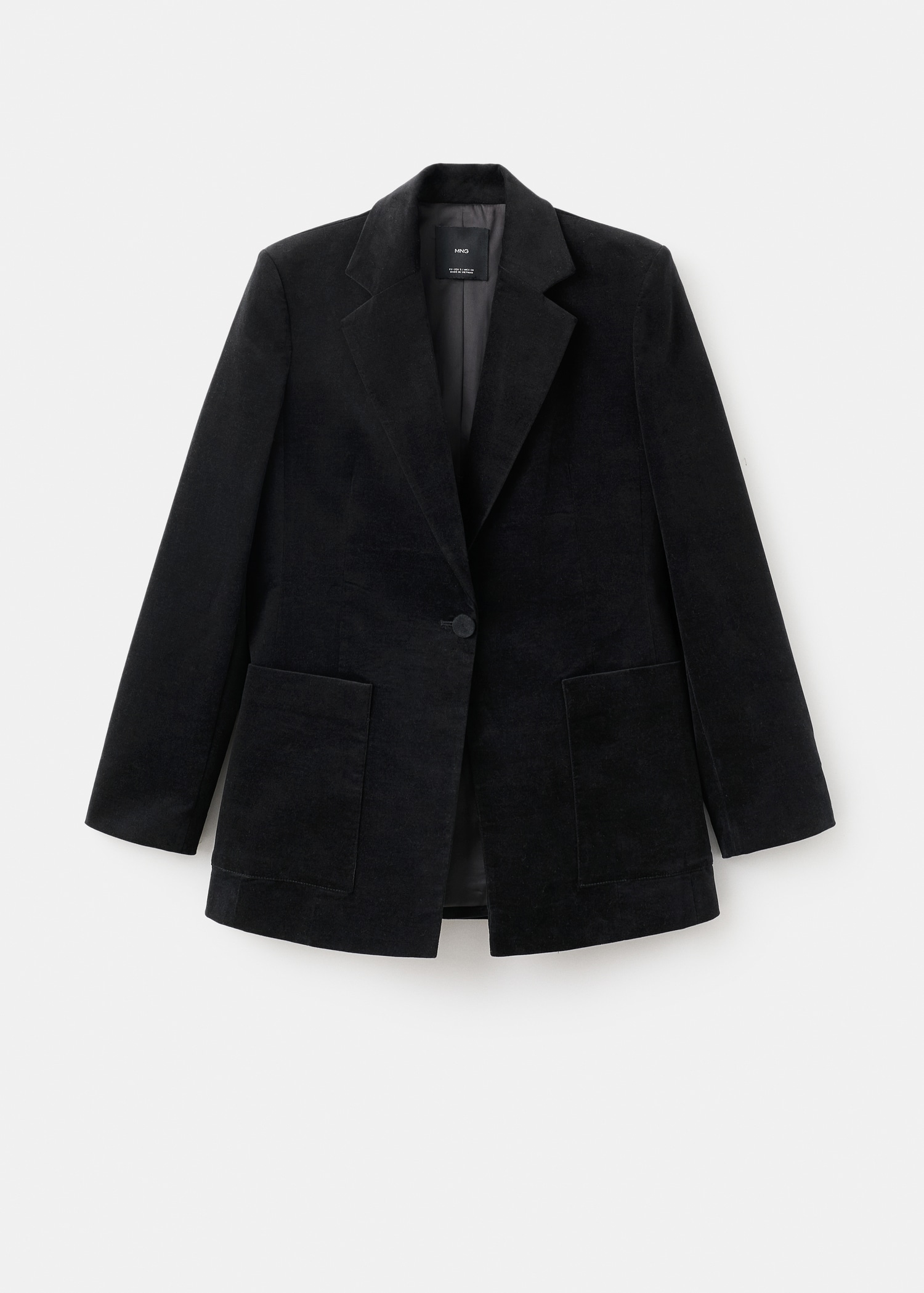 Материя Velveton. Прав дизайн. V-образно деколте с ревер. Яка с прорез. Дълъг ръкав. Два предни джоба с капак. Предно закопчаване с копче. Вътрешна подплата.