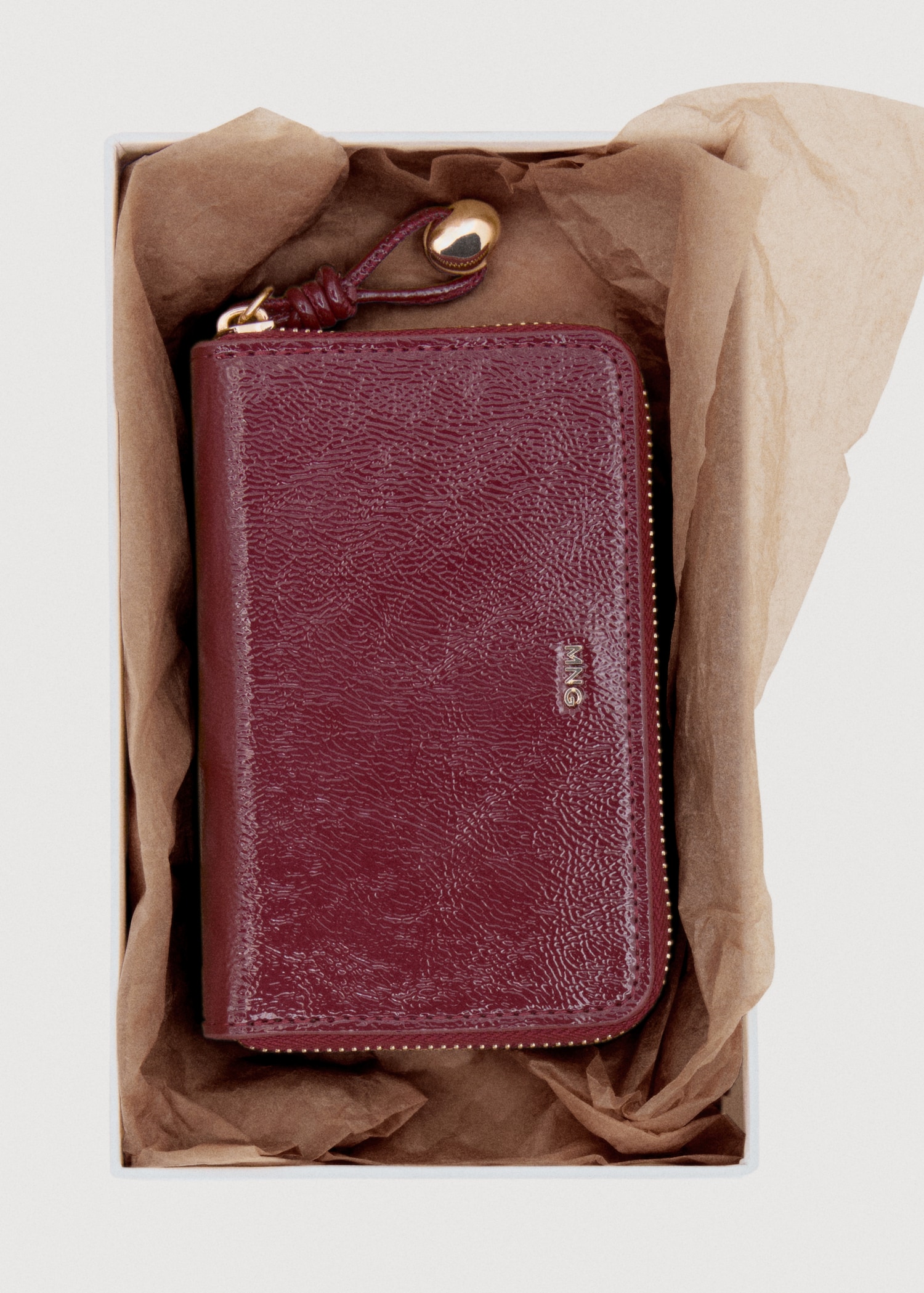 Среден размер. Ефект кожа. Няколко отделения за карти. Джоб с цип. Метално мънисто. Затваряне с цип.