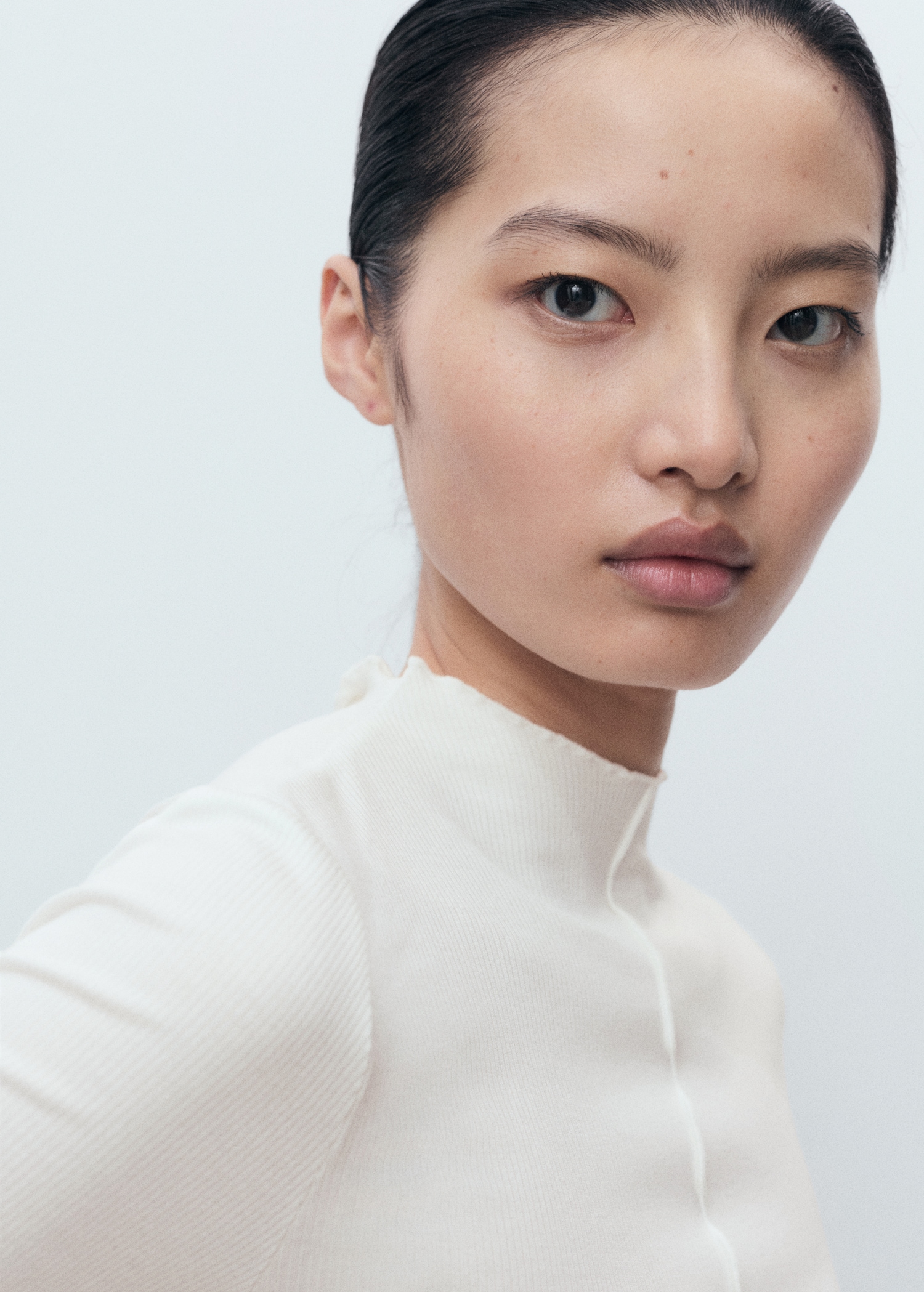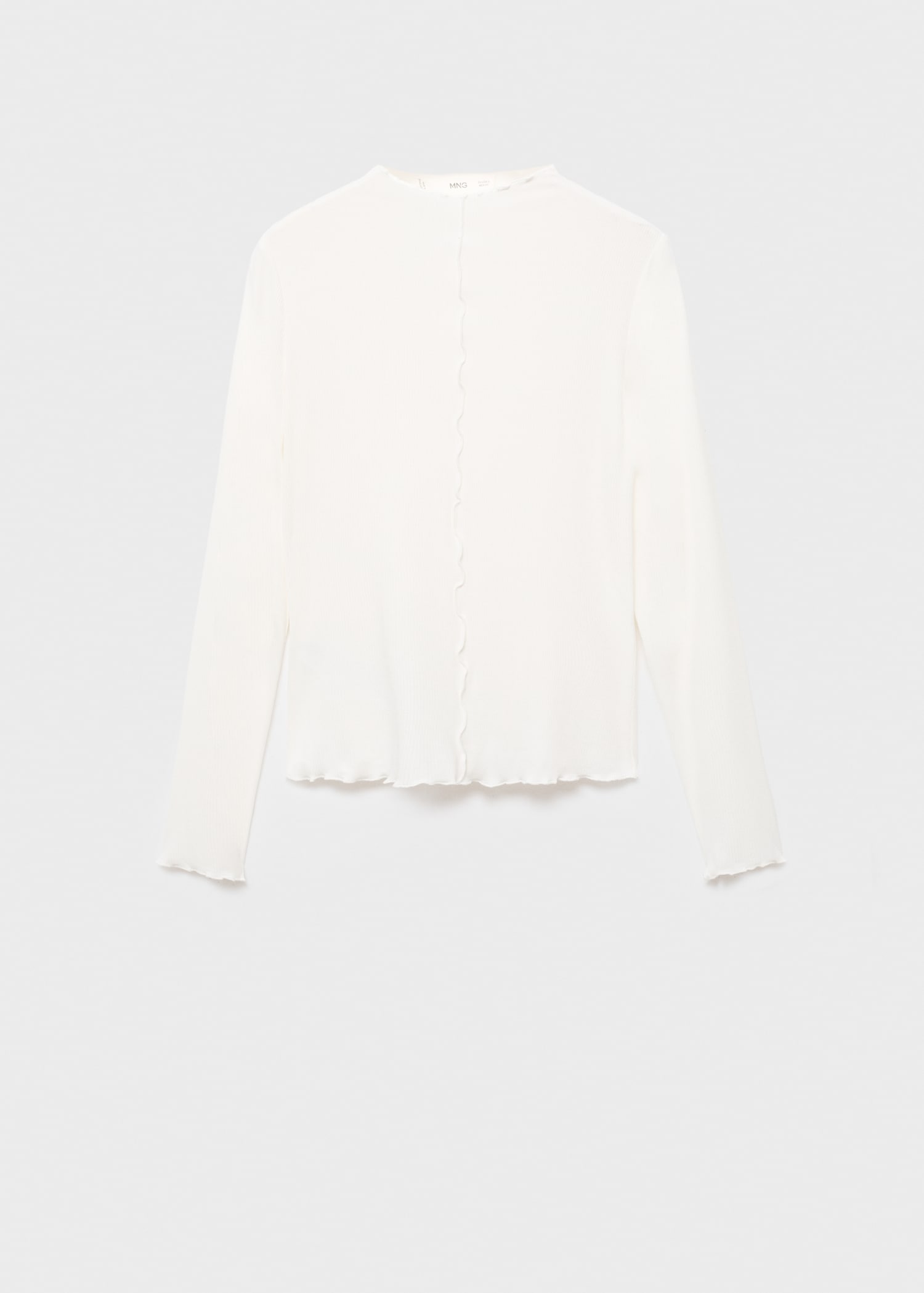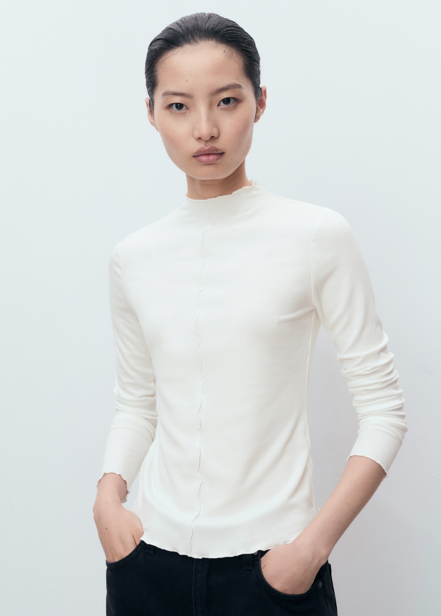 Изработена от рипсено трико, тази дреха има прилепнал дизайн с яка тип перкинс и дълъг ръкав. Включва детайл от шев и завършвания с вълнообразен ръб.