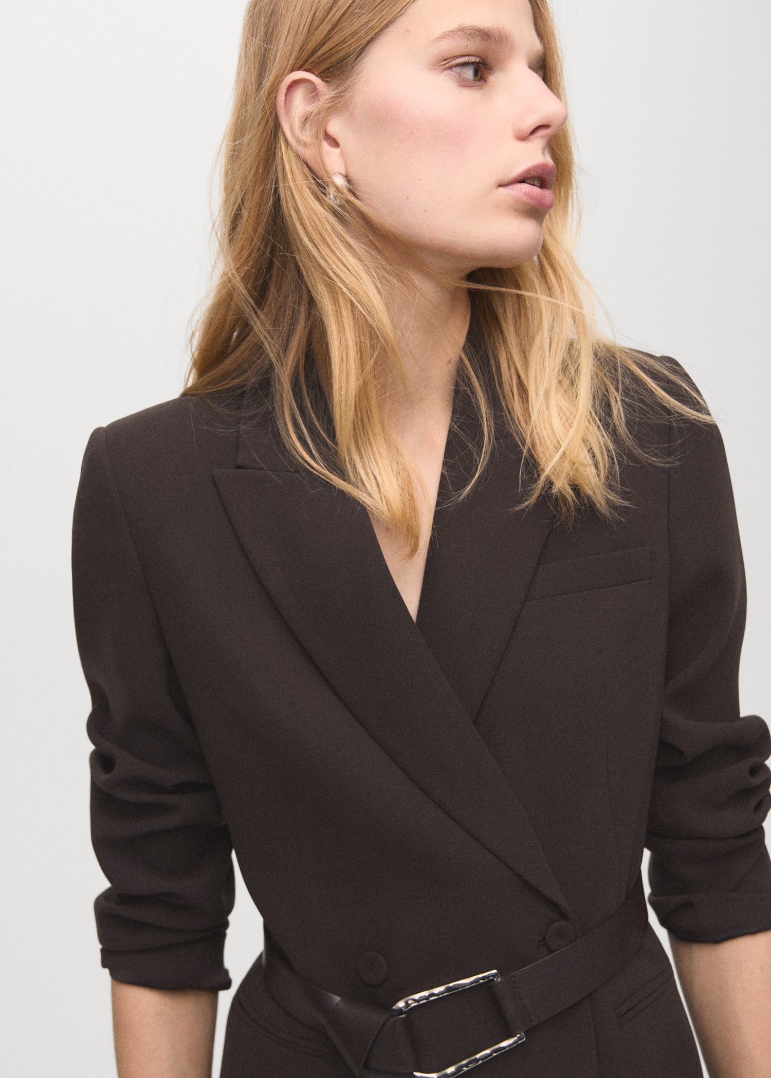 Стил костюм. Къс дизайн. Прав дизайн. V-образно деколте с ревер. Яка с прорез. Дълъг ръкав. Джоб с кант на гърдите. Два странични джоба с кант. Колан с катарама. Двуредно закопчаване. Вътрешна подплата.