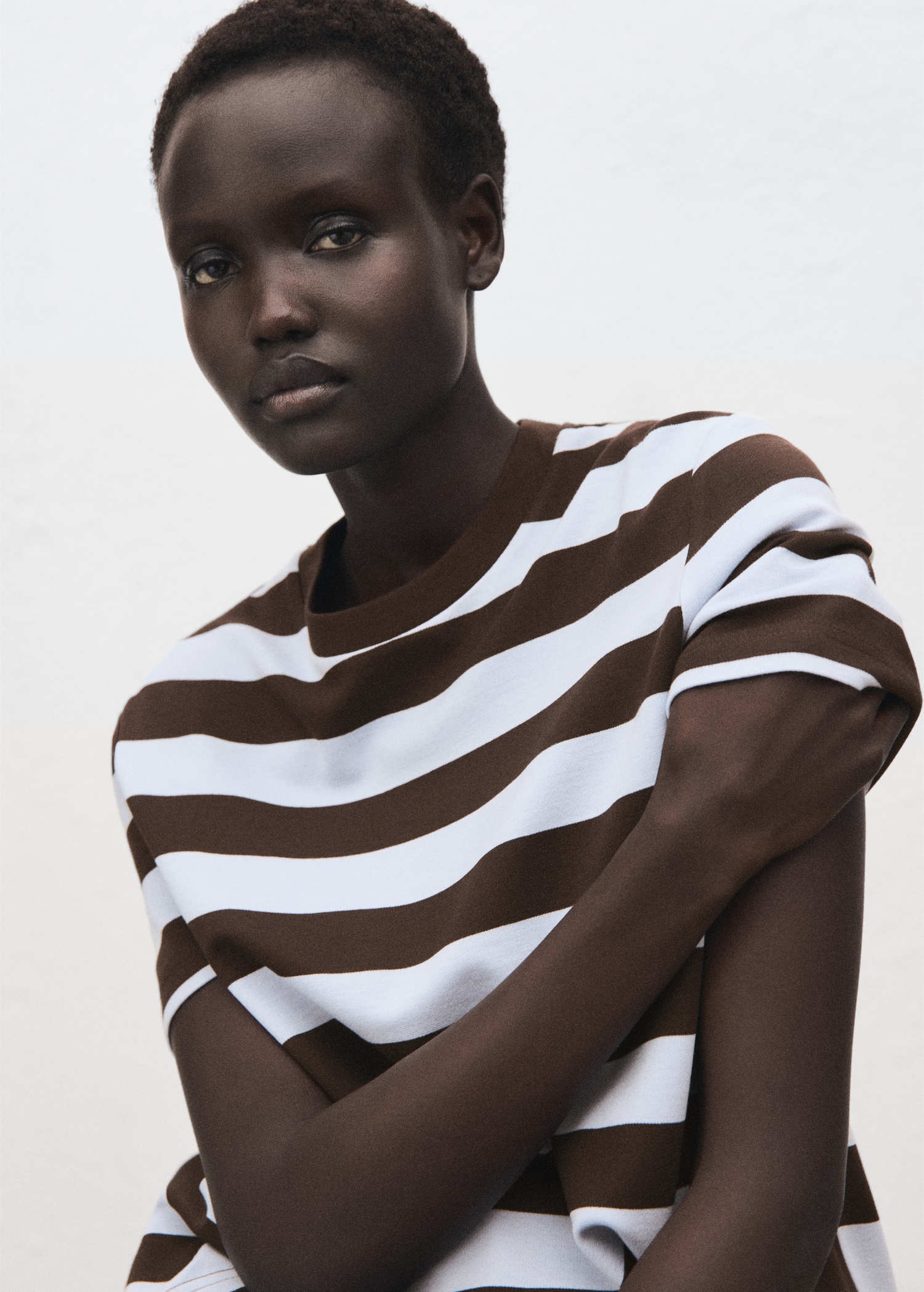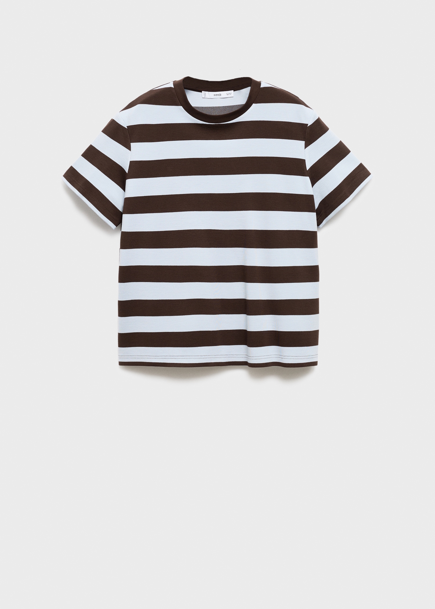 С прав дизайн и на райета, тази дреха е с кръгло деколте и къс ръкав. Без закопчаване.
