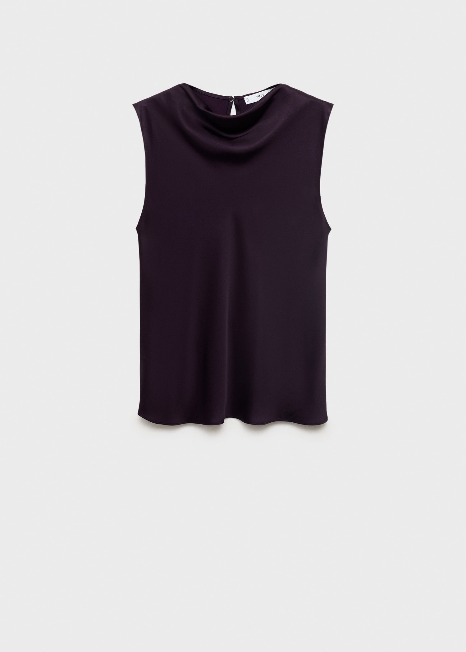 Сатенена материя. Прав дизайн. Драпирана яка. Без ръкави. Широки презрамки. Закопчаване с копчета на яката.