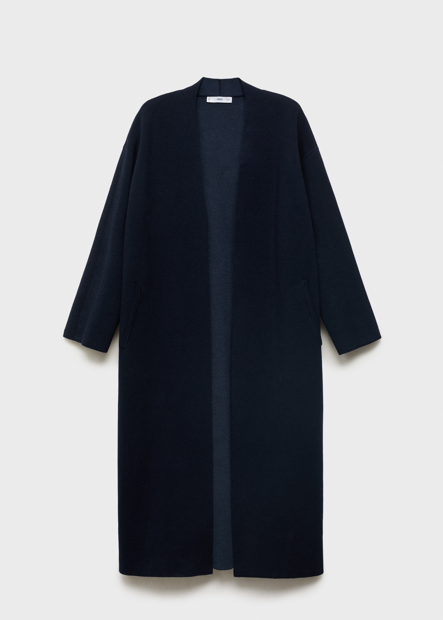 Плетена материя. Дълъг дизайн. яка с ревер. Дълъг ръкав. Два странични джоба. Без закопчаване.