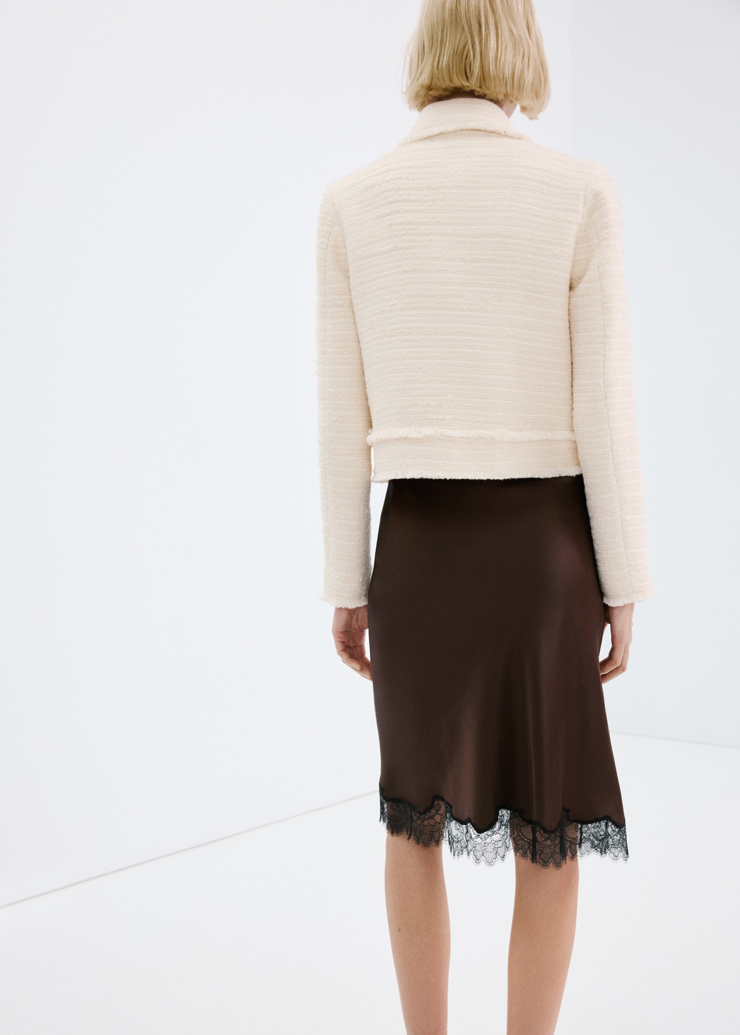 Туидова тъкан. Прав силует. яка с ревер. Дълги ръкави. Разнищени краища. Два предни джоба с капаци. Капак с копчета. Вътрешна подплата.