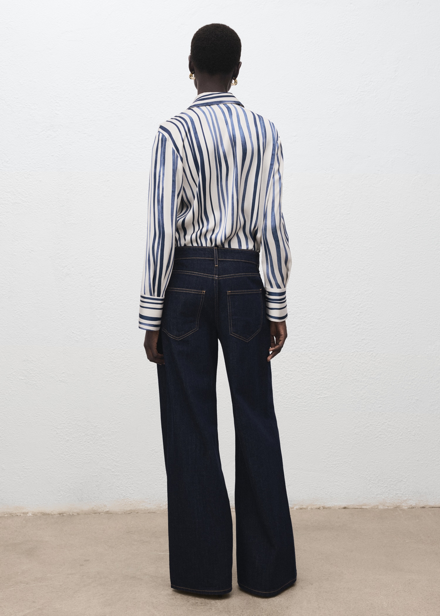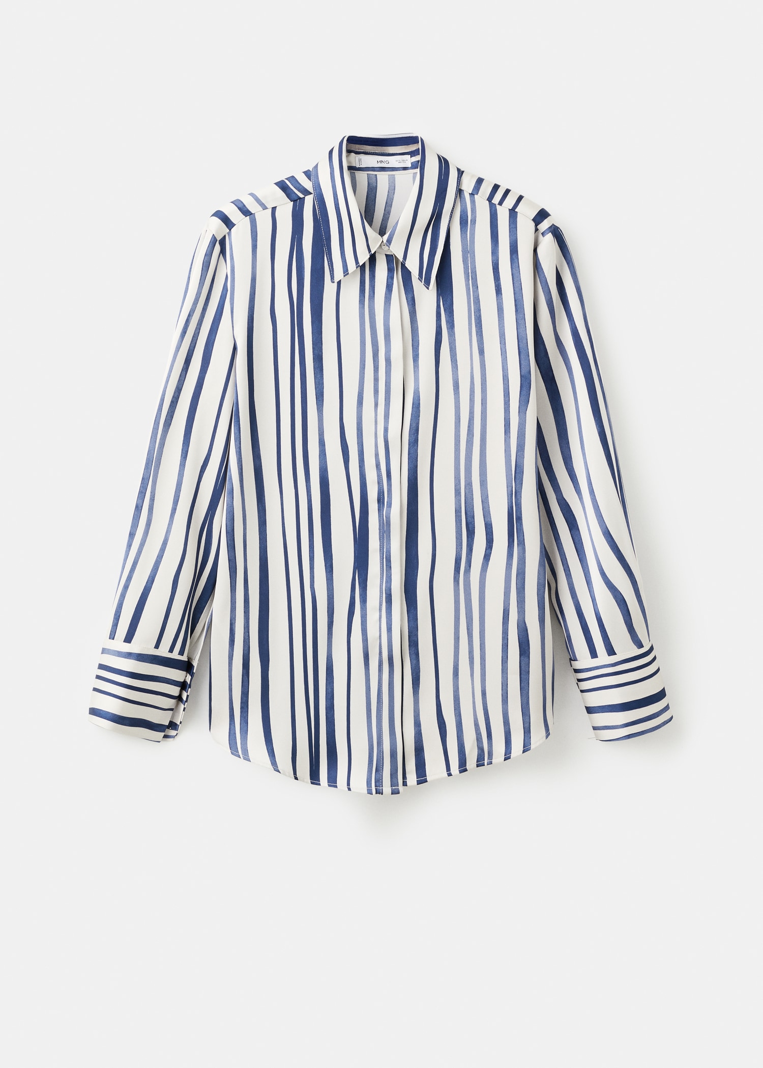 Плавна материя със сатенен завършек. Прав силует. Принт на райе. Яка тип риза. Дълъг ръкав с копчета на маншетите. Закопчаване с копчета отпред.