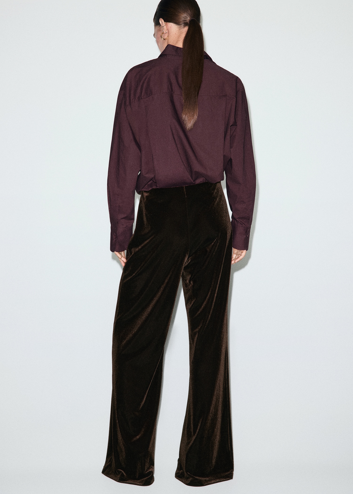 Кадифена материя. Дълъг дизайн. Дизайн с широки крачоли. Средна талия. Талия с еластична лента. Без закопчаване.