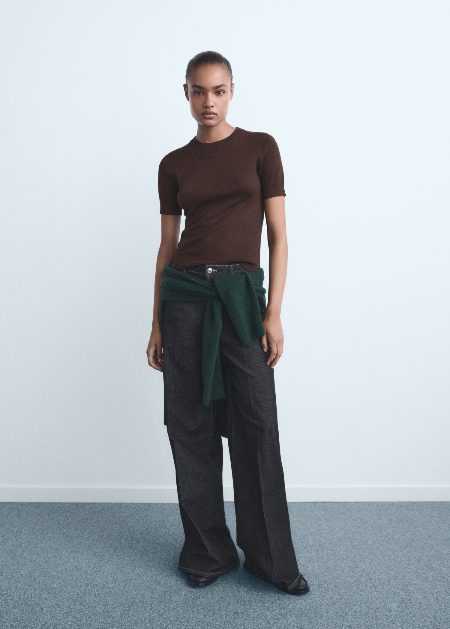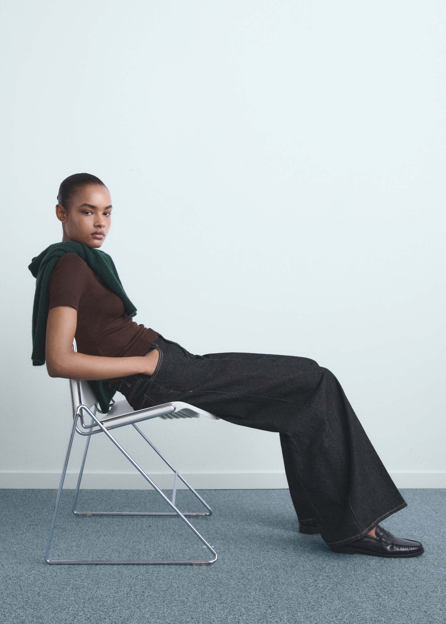 Памучна материя в стил деним. Дълъг дизайн. Дизайн с широки крачоли. Висока талия. Халки за колан. Пет джоба. Закопчаване с копче и цип. Вътрешен шев 83 см.