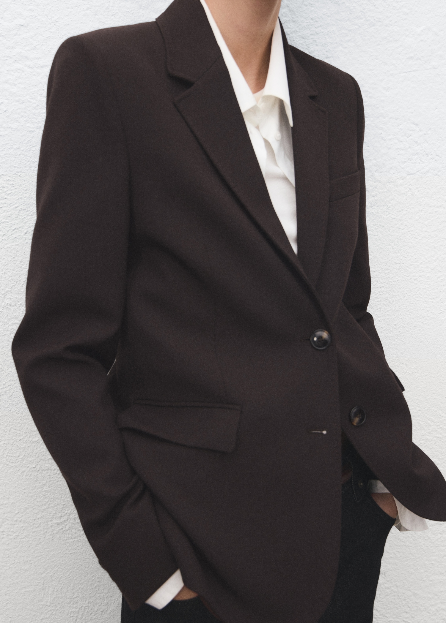 Стил костюм. Прав дизайн. V-образно деколте с ревер. Яка с прорез. Дълъг ръкав с копчета на маншетите. Два странични джоба с капак. Джоб с кант на гърдите. Предно закопчаване с копчета. Вътрешна подплата.