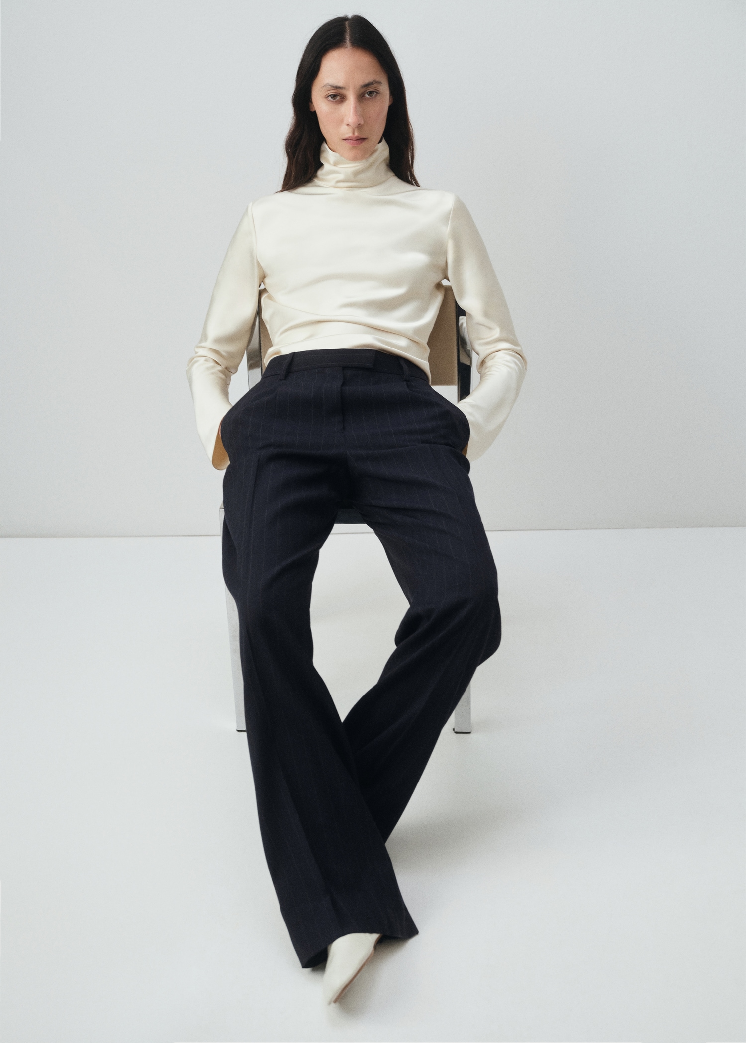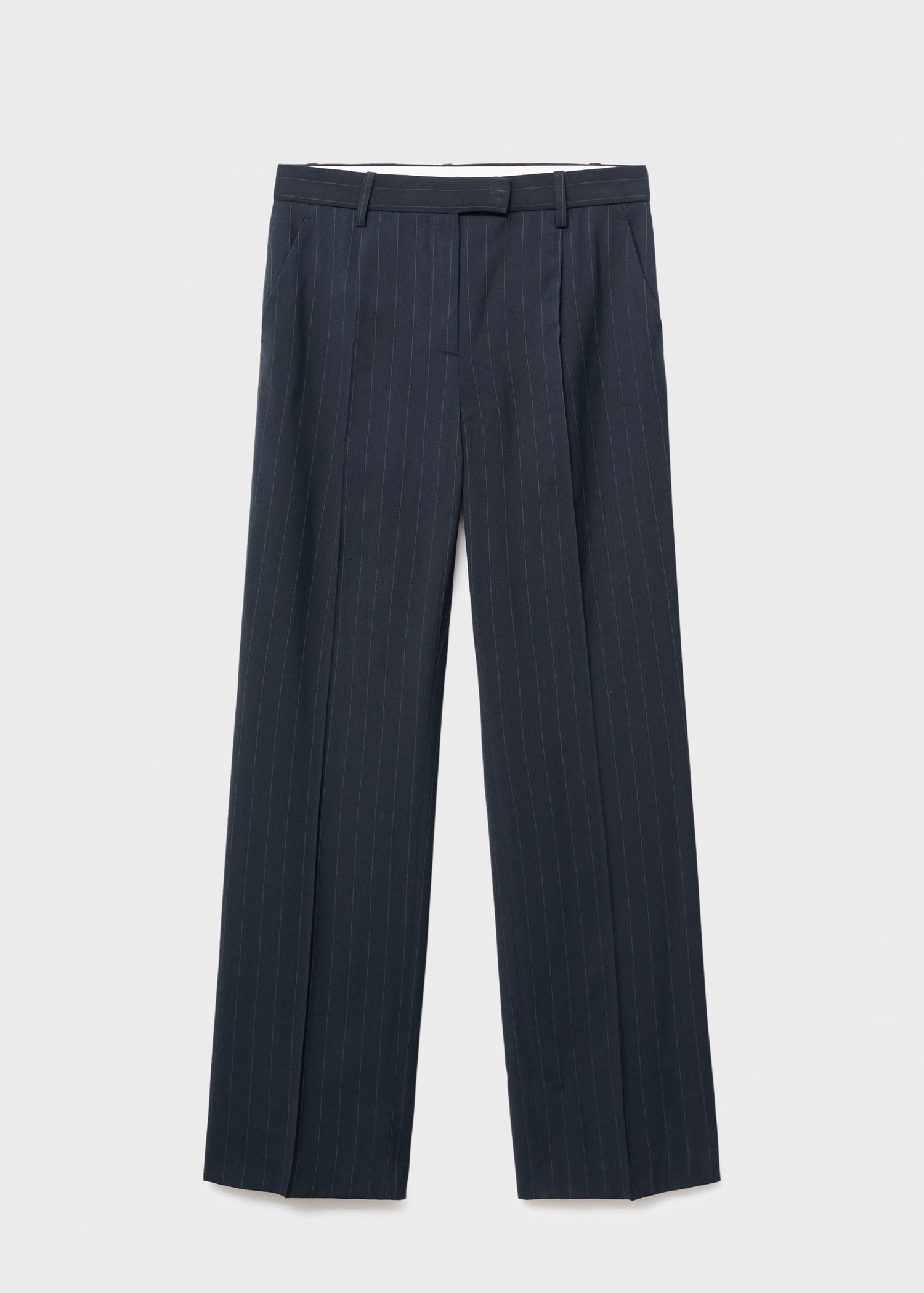 Смесена вълнена материя. Дълъг дизайн. Прав дизайн. Десен с тънки райета. Средна талия. Халки за колан. Два странични джоба. Детайл с басти. Предно закопчаване с копче, кука и скрит цип с капак. Вътрешна подплата.