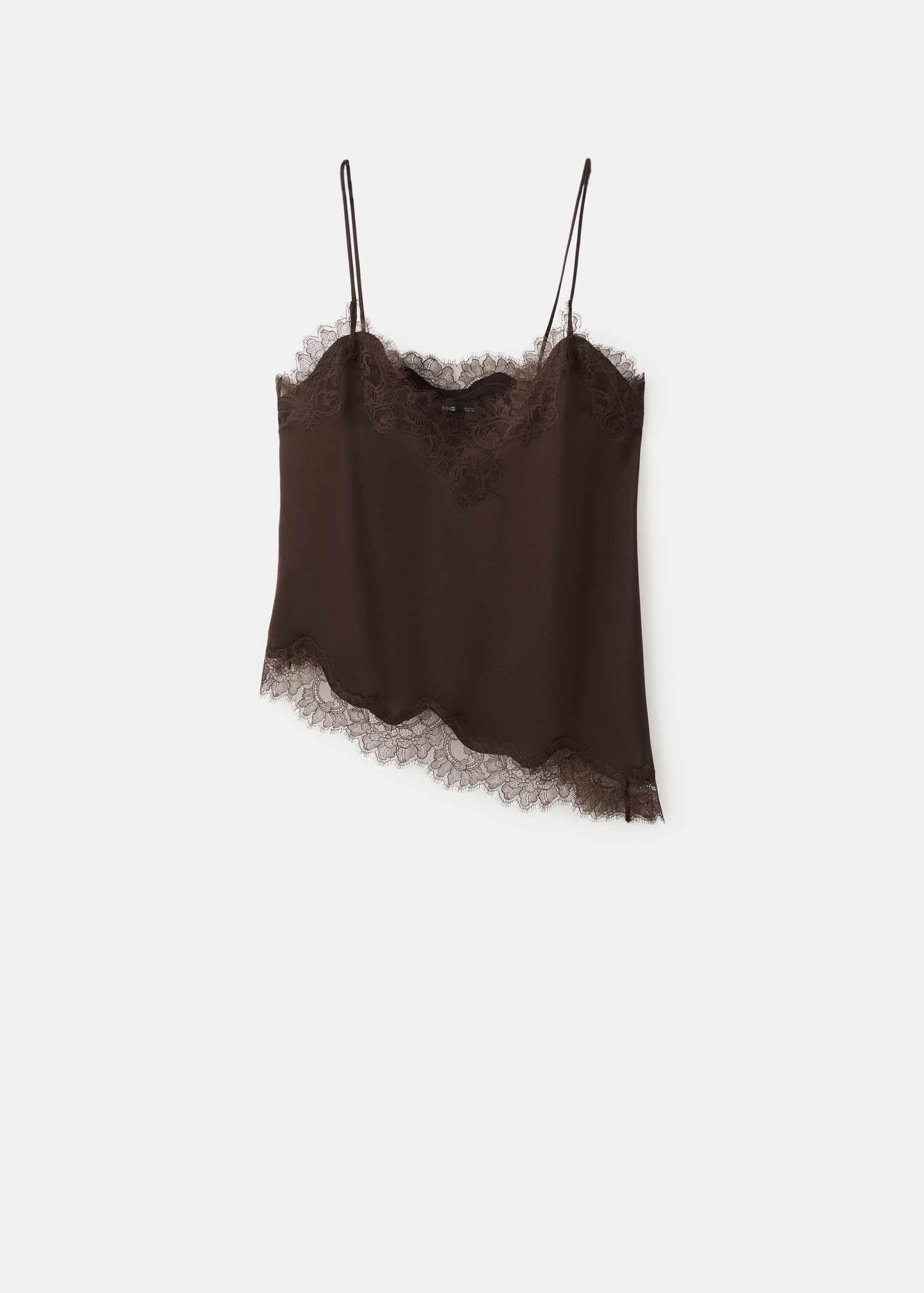 Сатенена материя. Асиметричен дизайн. Прав дизайн. V-образно деколте. Тънки презрамки. Дантелени кантове. Без закопчаване.