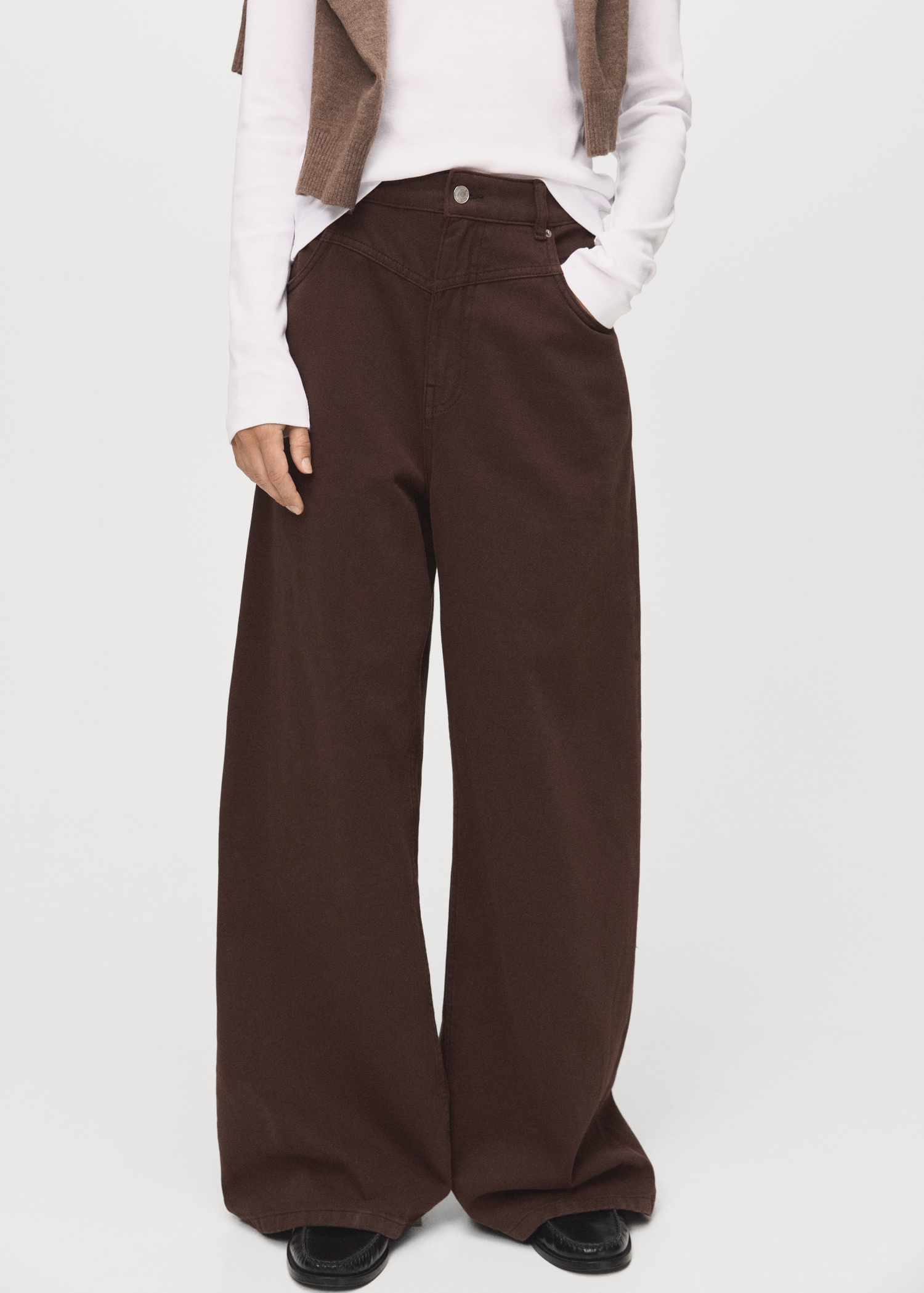 Памучна материя в стил деним каубой. Дълъг дизайн. Дизайн с широки крачоли. Свободна кройка. Средна талия. Халки за колан. Пет джоба. Детайл на шева на бедрото. Предно закопчаване с цип и копче.