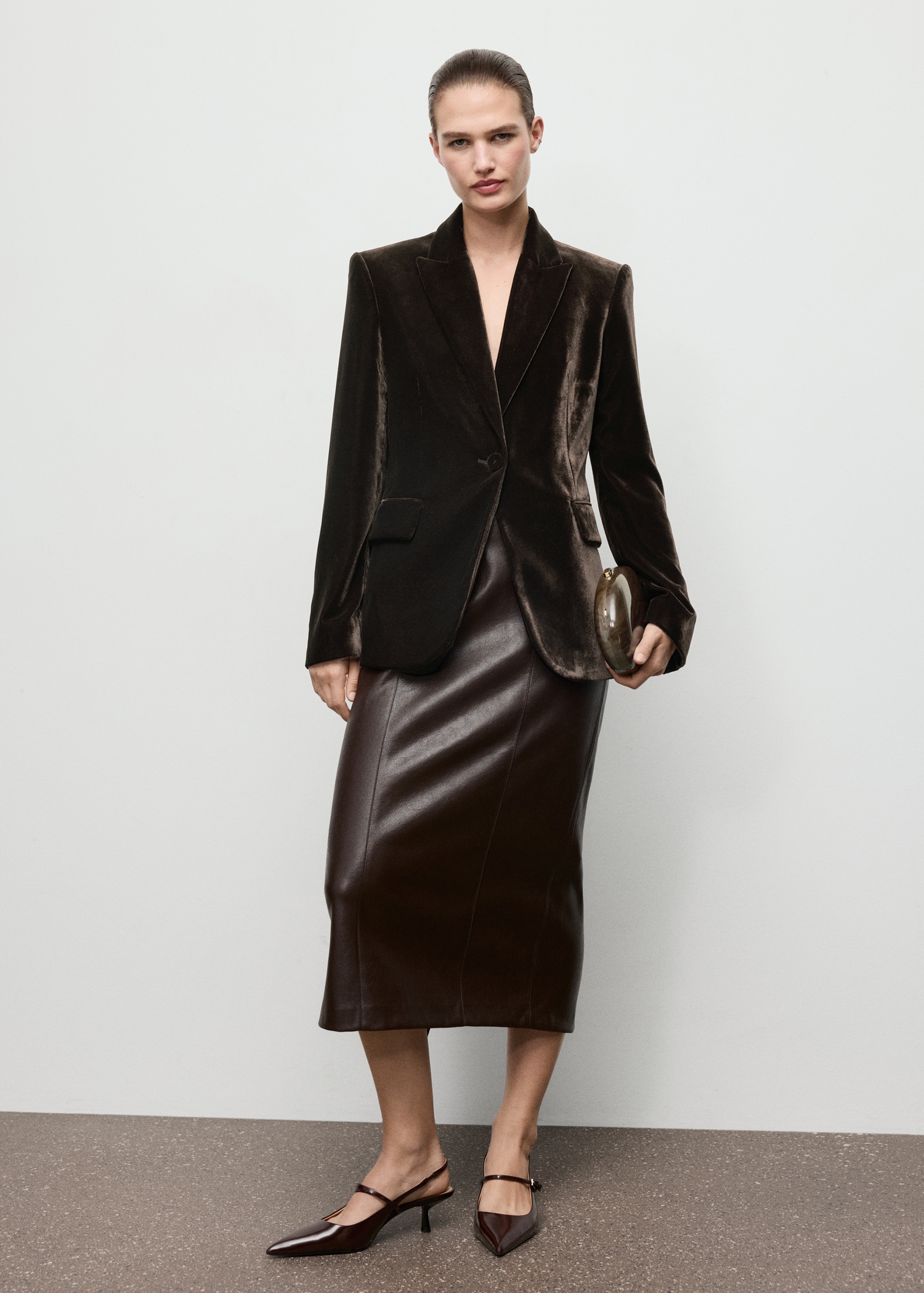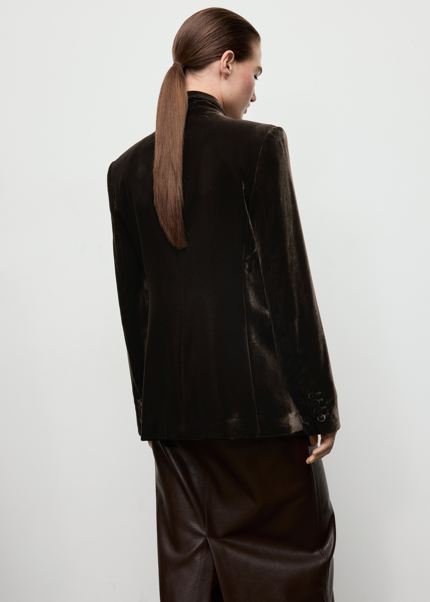Кадифена материя. Прав дизайн. V-образно деколте с ревер. Яка с прорез. Дълъг ръкав с копчета на маншетите. Два джоба с капаци отпред. Предно закопчаване с копче. Вътрешна подплата.