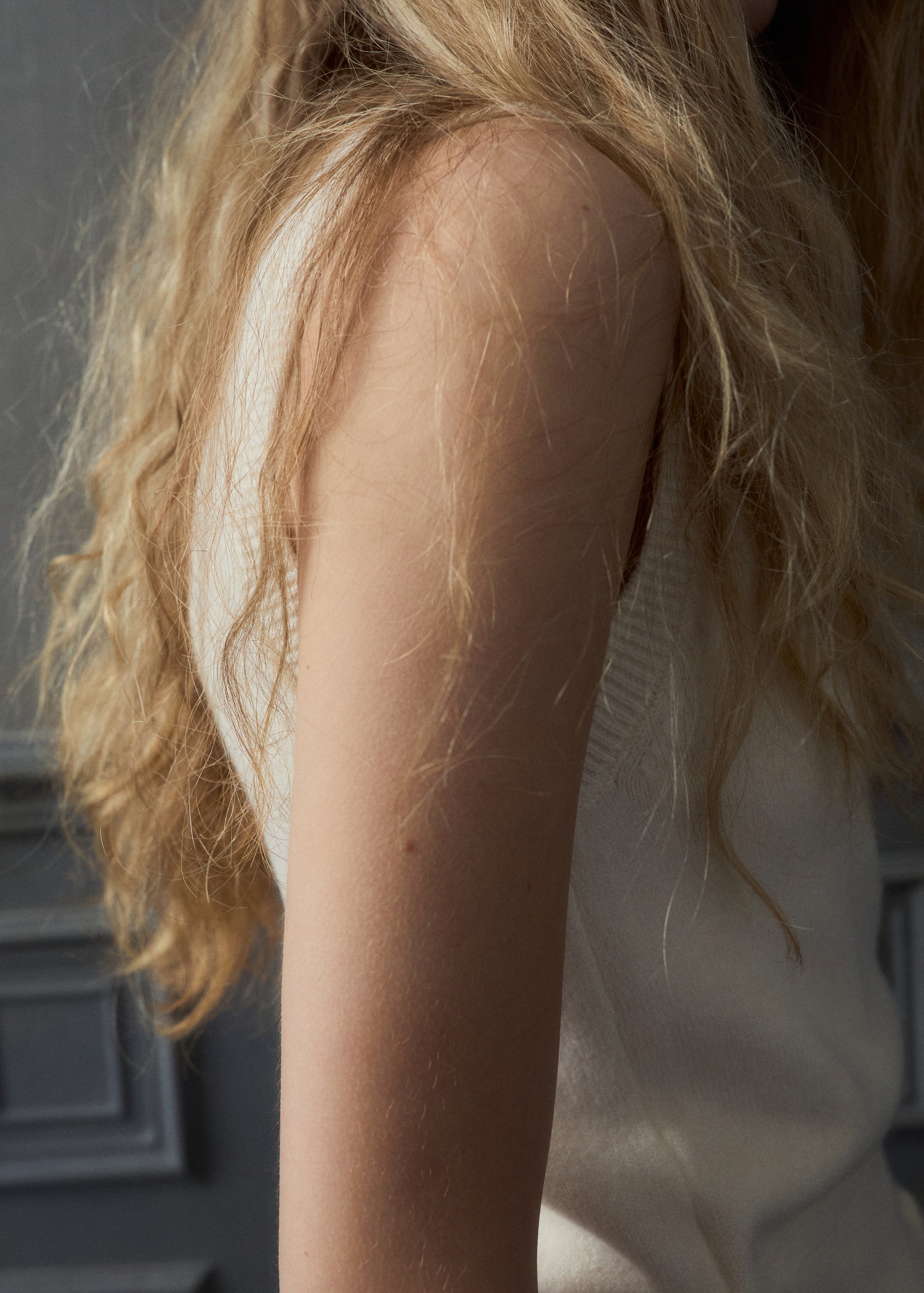 Средно плетиво. Прав дизайн. Обърната яка. Без ръкави. Тясна талия. Без закопчаване.