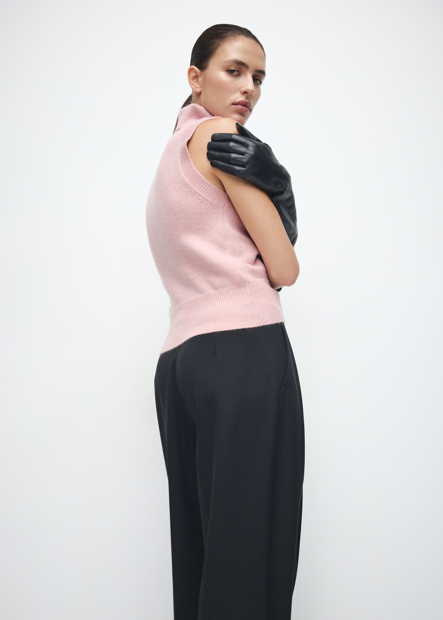 Средно плетиво. Прав дизайн. Обърната яка. Без ръкави. Тясна талия. Без закопчаване.