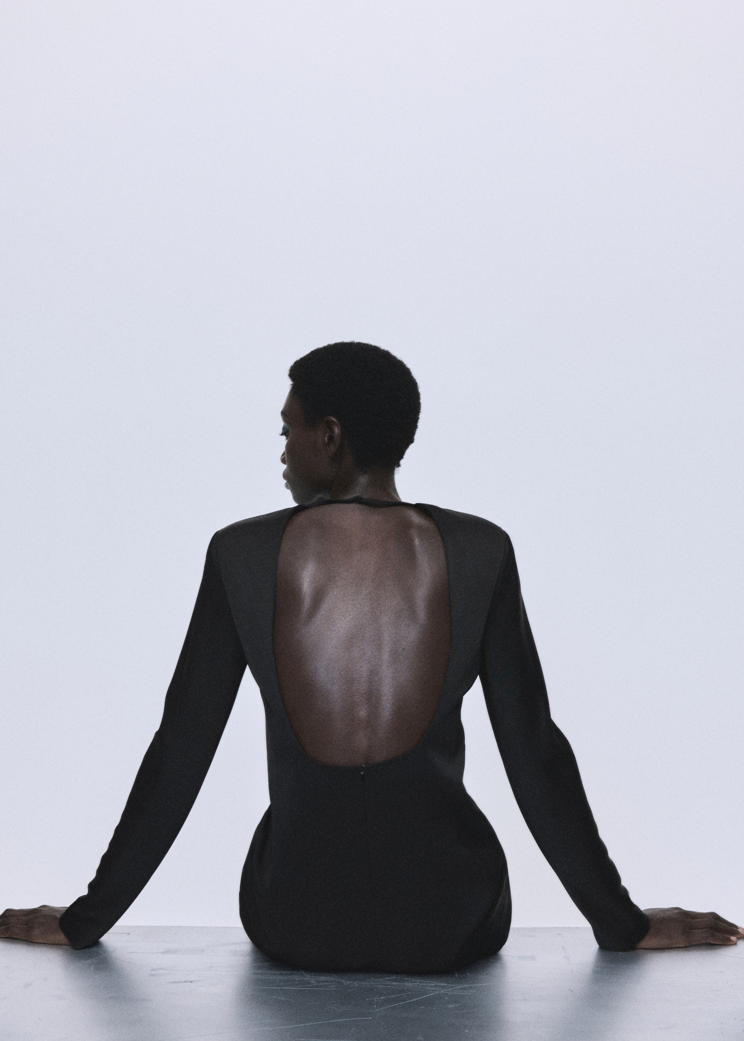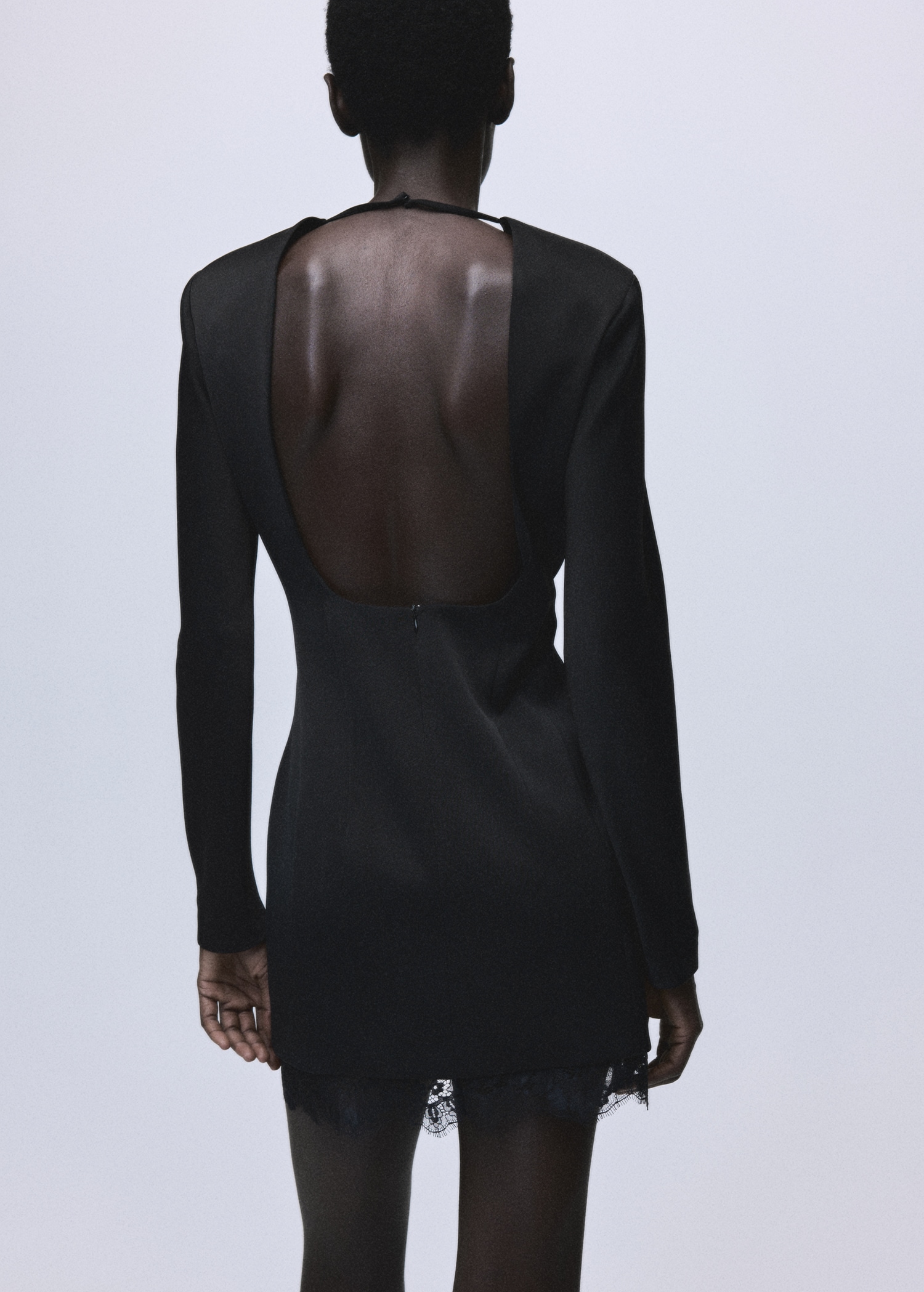 Къс дизайн. Втален дизайн. Кръгло деколте. Дълги ръкави. Гръб с отворена линия и презрамка. Дантелен подгъв. Цип на гърба. Закопчаване с копче на врата. Вътрешна подплата.