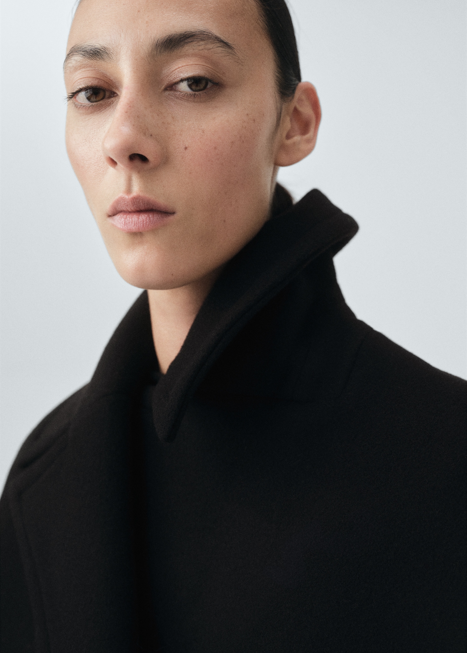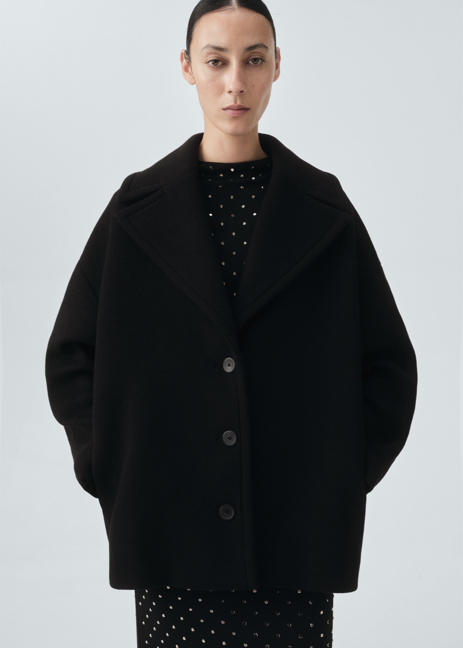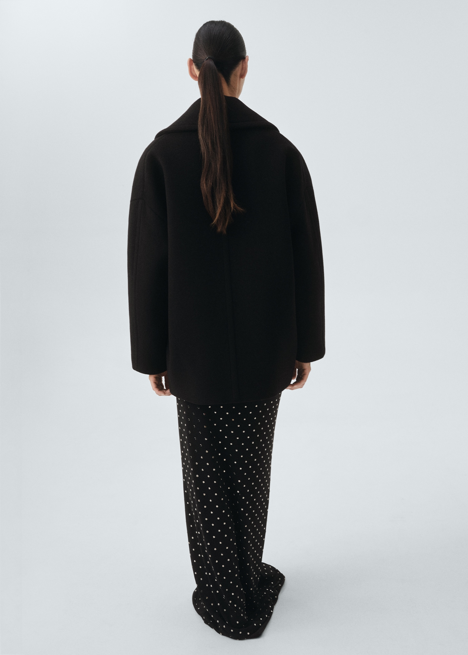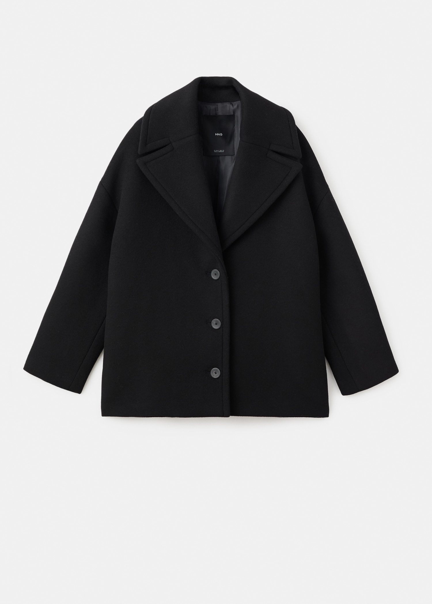 Изработен от вълнен плат, този оувърсайз дизайн има V-образно деколте с ревер. Включва дълги ръкави, предно закопчаване с копчета и вътрешна подплата.