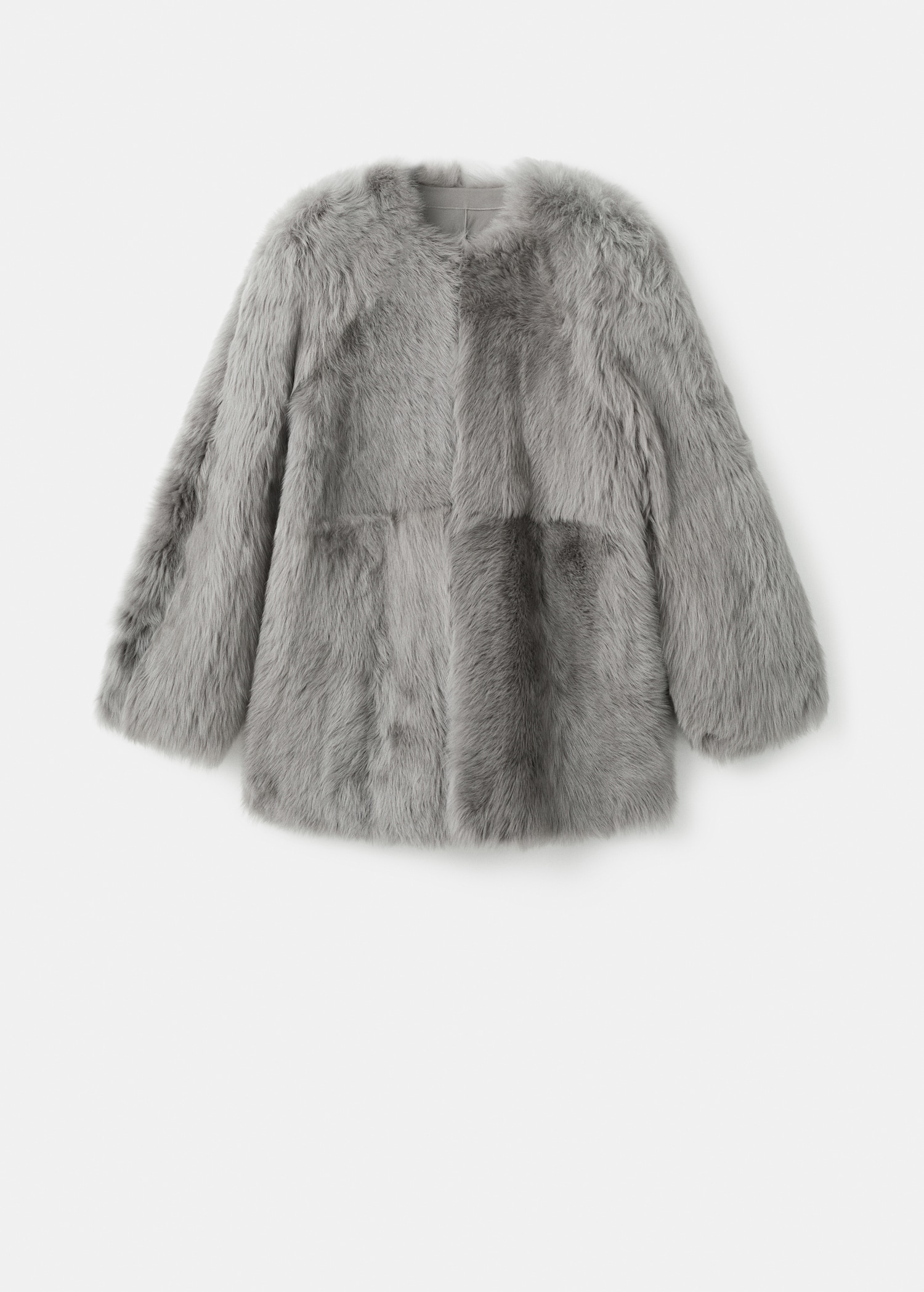Изработено от 100% телешка кожа с косъм, това палто има прав двулицев дизайн. Включва кръгло деколте, дълги ръкави и два странични джоба. Предното закопчаване с копчета допълва неговия функционален стил