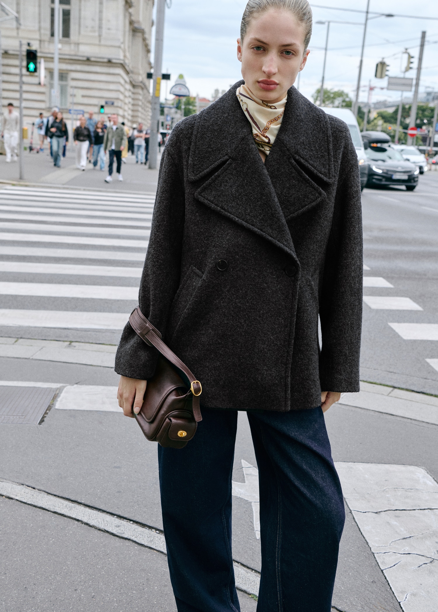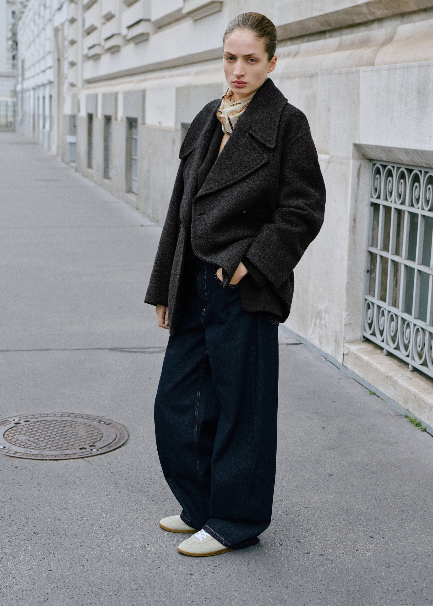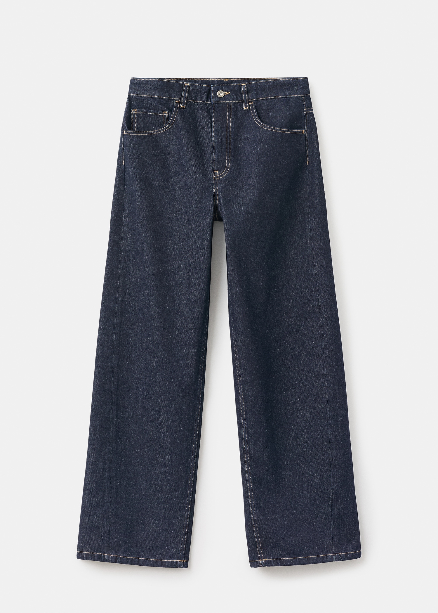 Памучна материя в стил деним. Изплакване. Балонен дизайн. Барел стил. Дълъг дизайн. Средна талия. Халки за колан. Пет джоба. Предно закопчаване с цип и копче.