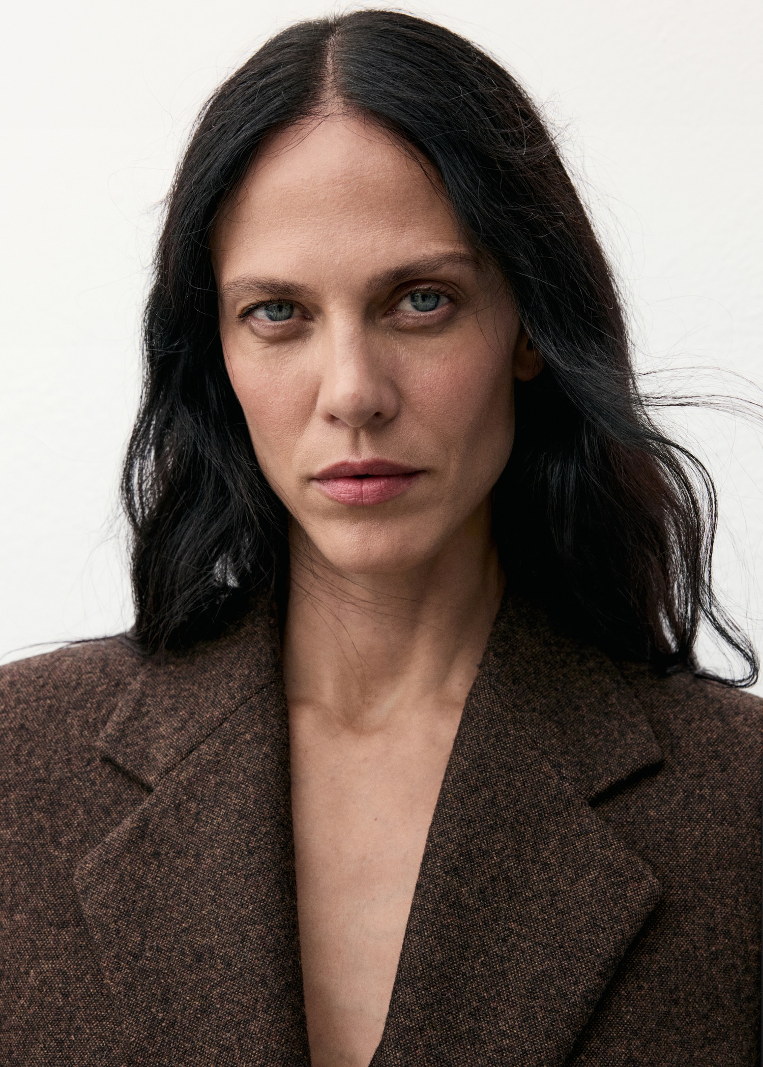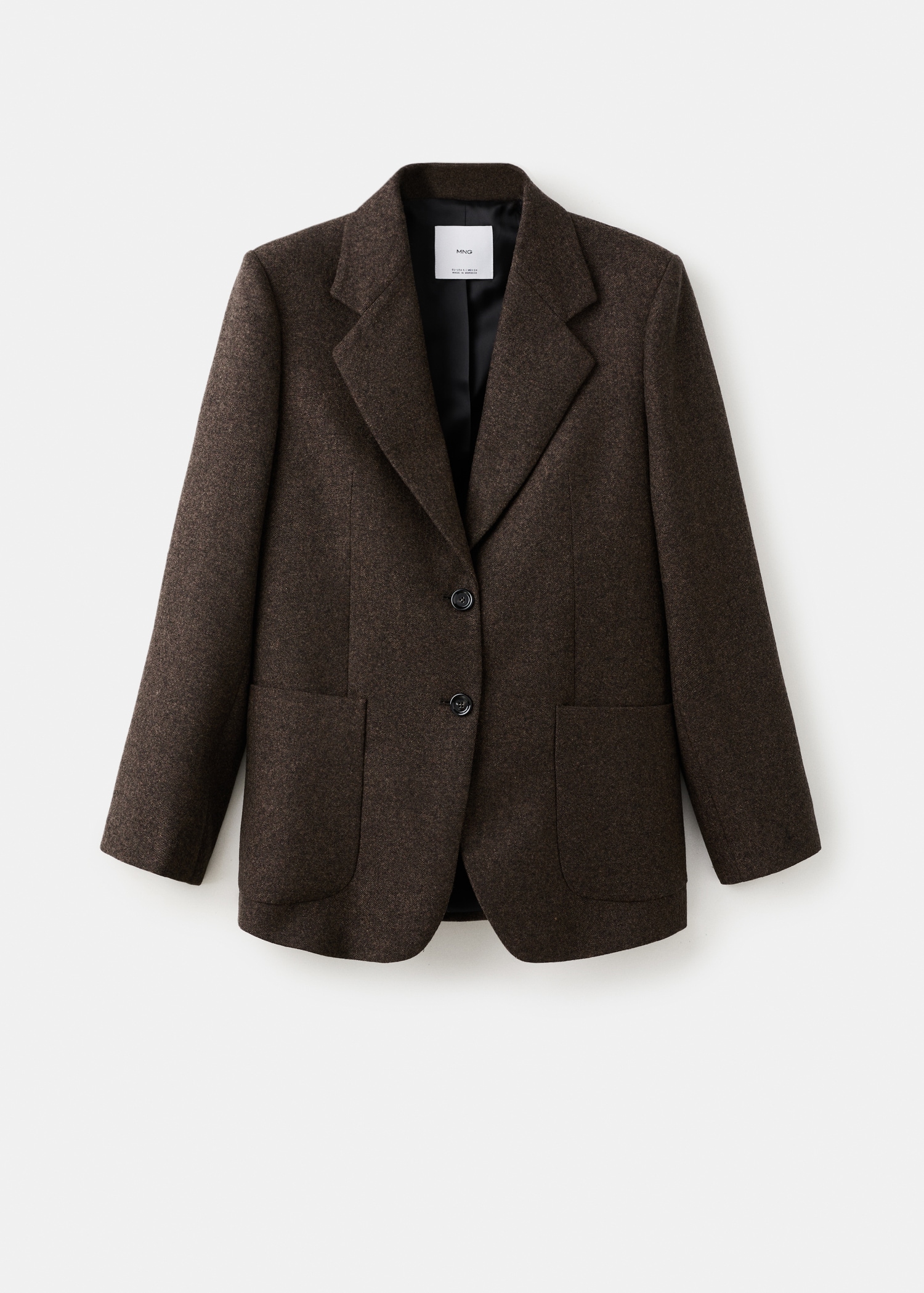 Стил костюм. Смесена вълнена материя. Меланжиран жакард. Прав дизайн. V-образно деколте с ревер. Яка с прорез. Дълъг ръкав с копчета на маншетите. Два предни джоба с капак. Заден отвор в долната част. Предно закопчаване с копчета. Вътрешна подплата.