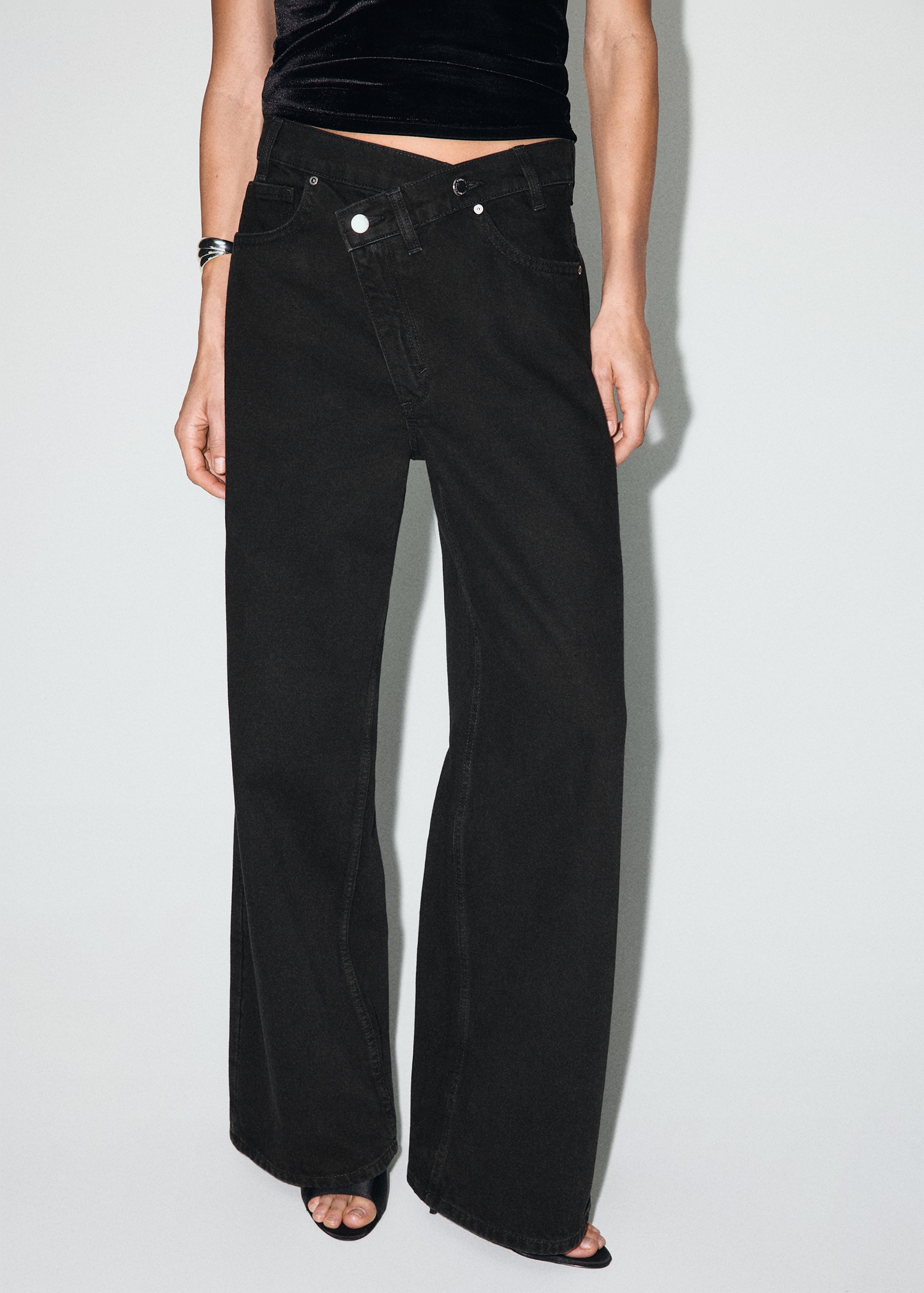 Памучна материя в стил деним. Дълъг дизайн. Дизайн с широки крачоли. Средна талия. Кръстосана талия. Халки за колан. Пет джоба. Асиметрично предно закопчаване с цип и копчета.
