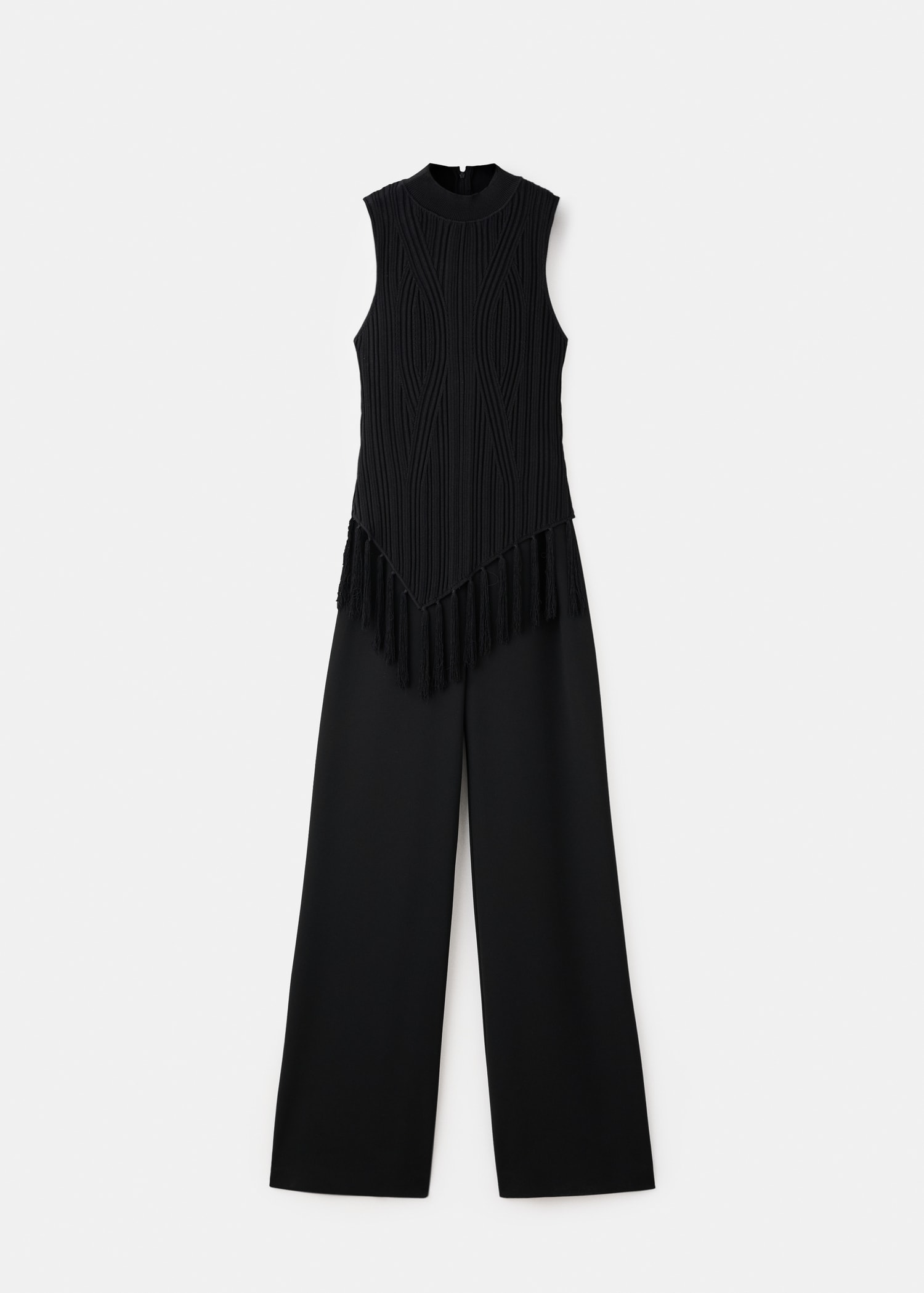 Плат с текстура. Дълъг дизайн. Комбиниран дизайн. Перкинс яка. Без ръкави. Широки презрамки. Детайл с ресни. Цип на гърба. Вътрешна подплата.